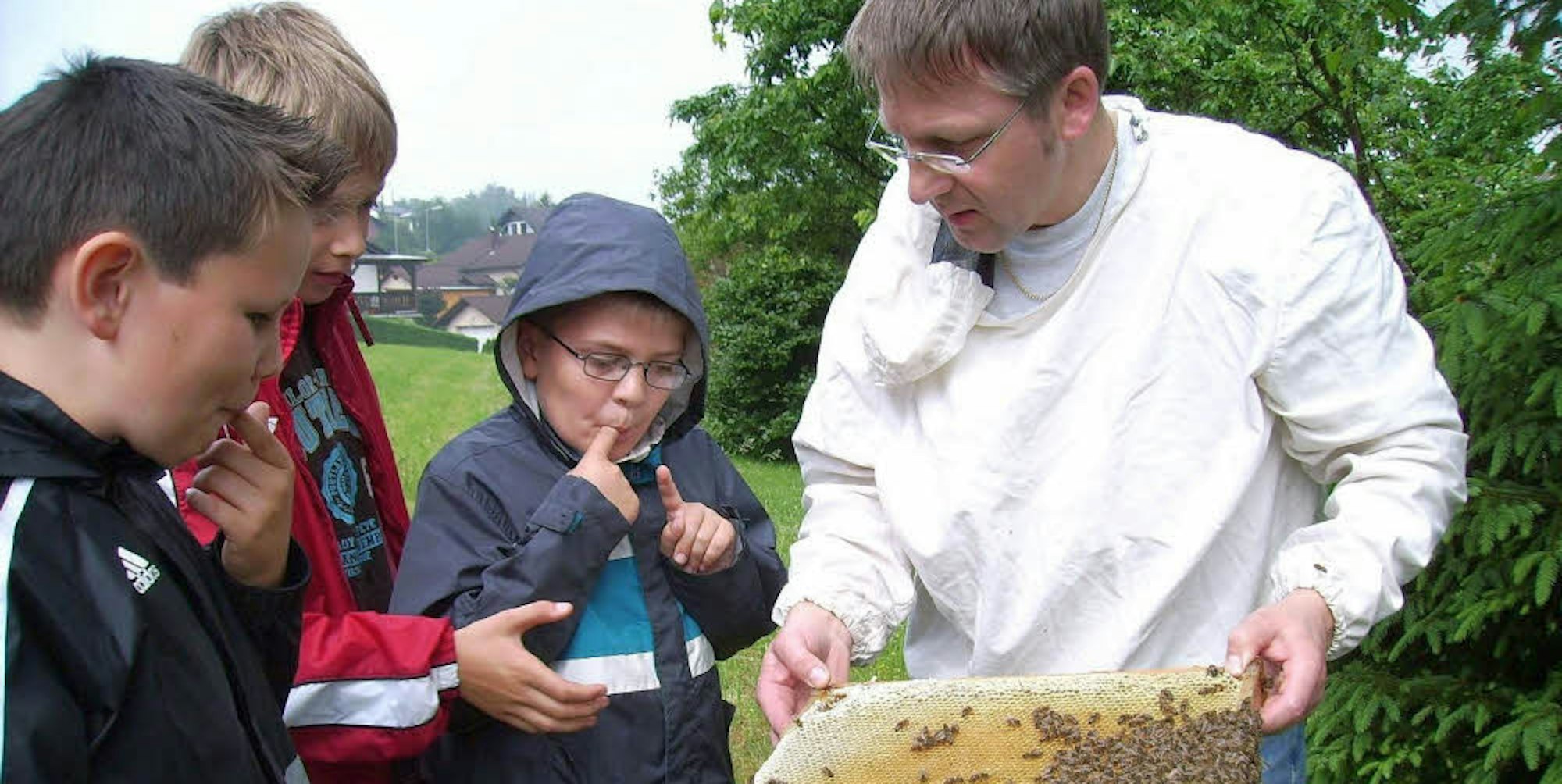 So geht das: Ein Imker zeigt Kindern immer gern seine Arbeit.