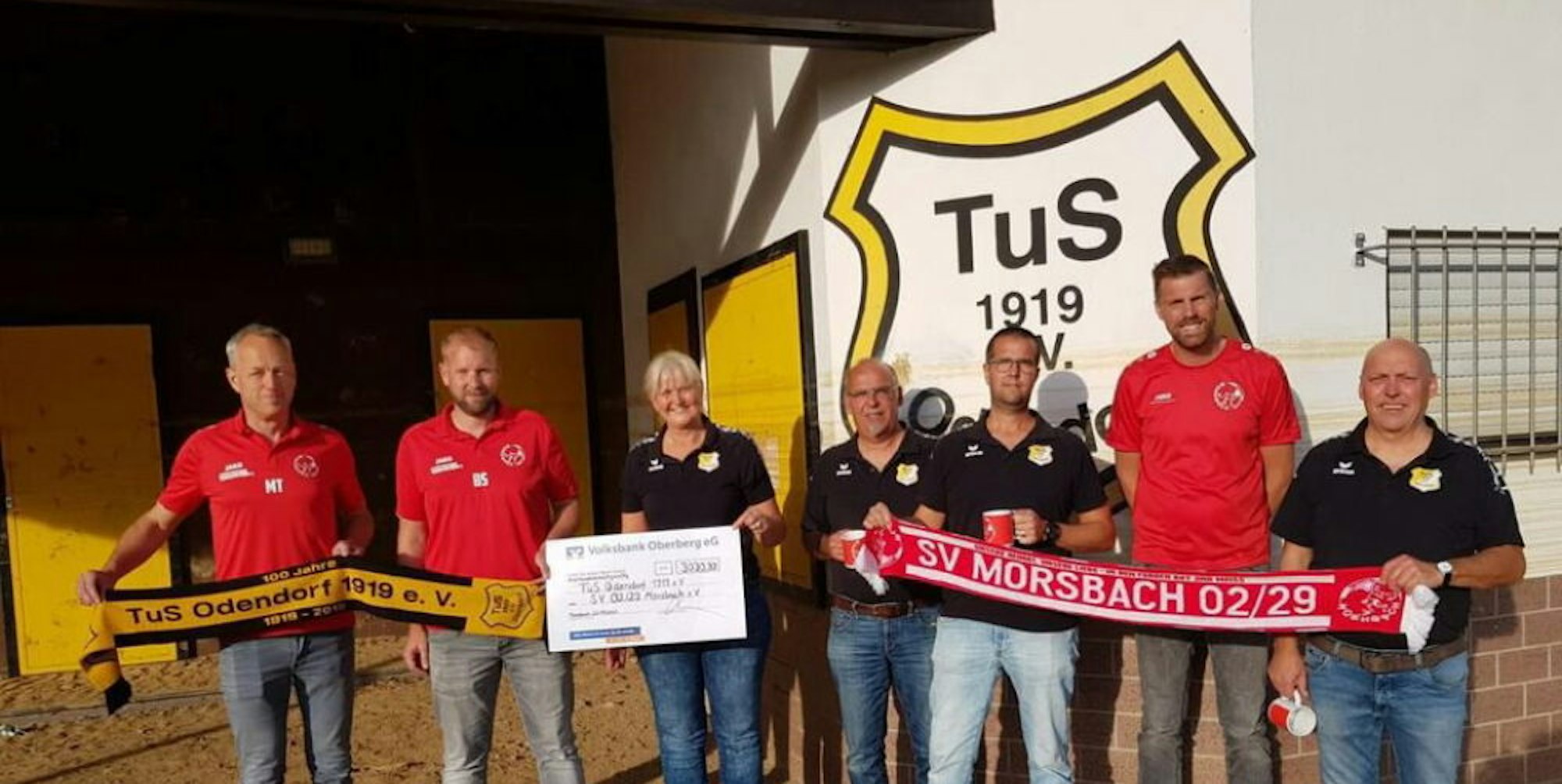Odendorf/Morsbach – Gelebte Solidarität unter Fußballern: Unter dieses Motto hatte der SV Morsbach kürzlich sein Heimspielwochenende auf dem Sportplatz „Auf der Au“ gestellt. Der gesamte Erlös aus Eintrittsgeldern sowie dem Speisen- und Getränkeverkauf im Vereinsheim war für den von der Flutkatastrophe stark betroffenen TuS Odendorf. Dank des Engagements von Aktiven, Trainern und Eltern der Jugendspieler des SVM sowie der großzügigen Unterstützung von Partnern aus dem Einzelhandel kamen 3030,30 Euro zusammen.