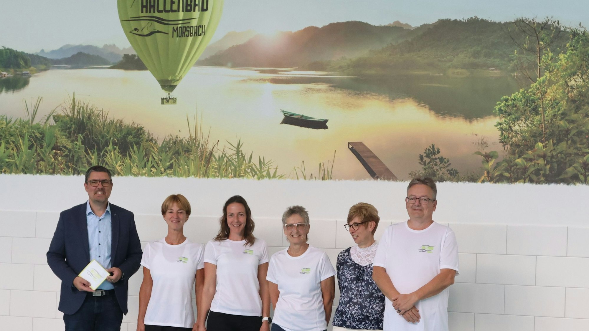 Bürgermeister Jörg Bukowski (l.) und das Schwimmbadteam unter dem neuen Wandbild.