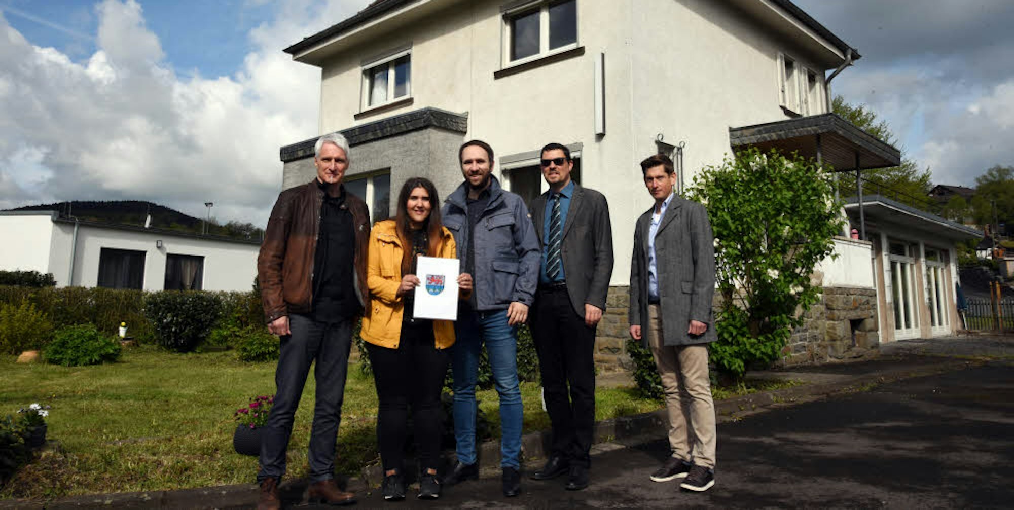 Hilfe von der Gemeinde Morsbach bekommen Valentina Iervasi und Vitali Puffal (3.v.r.). Den ersten Förderbescheid für eine Haussanierung übergaben gestern Architekt Ralf Hoppe (l.), Bürgermeister Jörg Bukowski (2.v.r.) und Benjamin Schneider (r.).