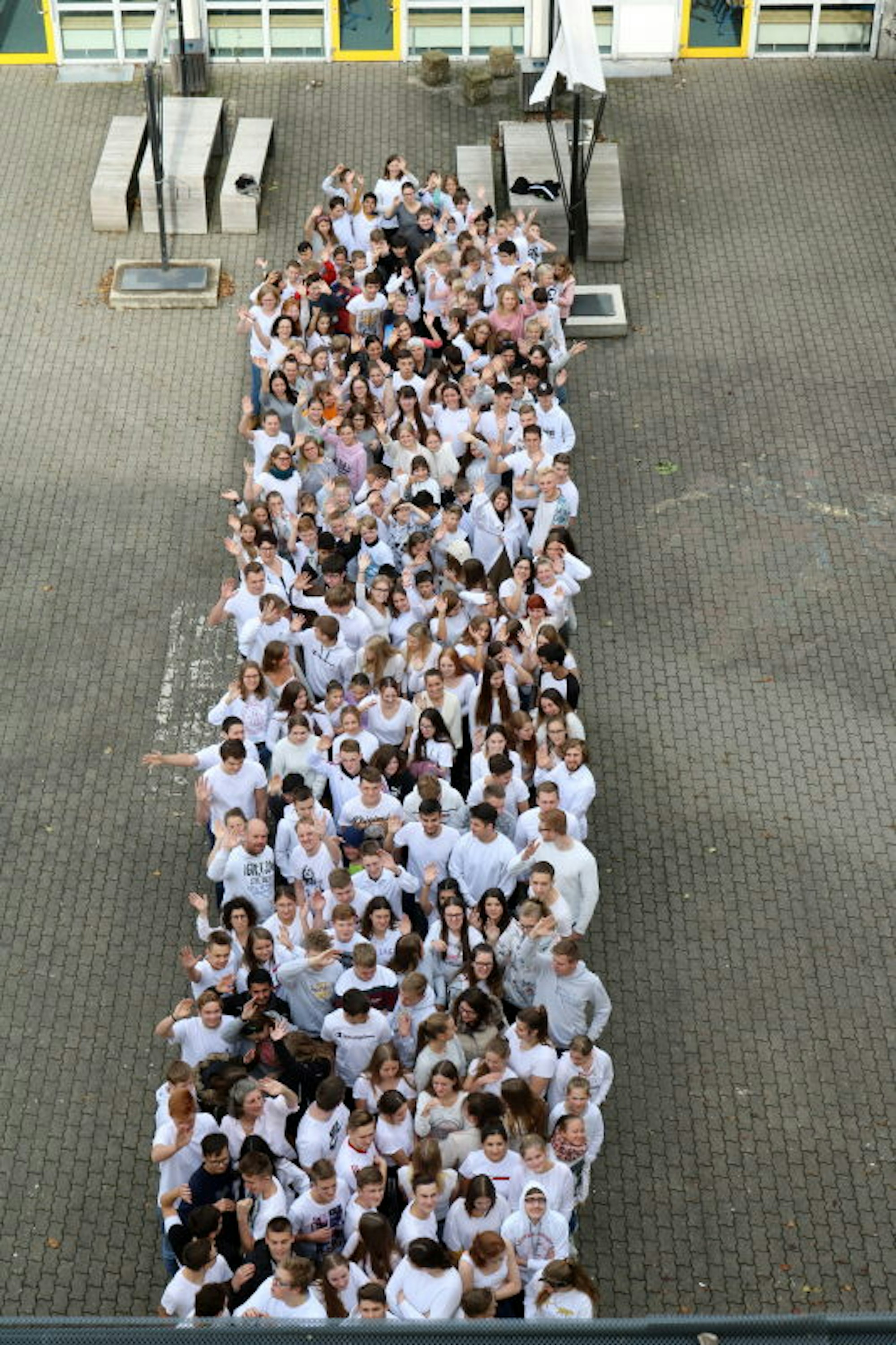 Minuten später haben etwa 350 Schüler ihren Platz gefunden, sie formen eine fast 18 Meter lange Kerze. Und die jungen Leute in der Flamme lassen die Lampen an den Mobiltelefonen leuchten: Nach dem Anschlag in Halle am vergangenen Mittwoch wollen sie ein Zeichen setzen gegen Antisemitismus, Rassismus und Diskriminierung und für Solidarität, Hoffnung und Toleranz. Weil der Anschlag an Jom Kippur, dem Versöhnungsfest und dem höchsten jüdischen Feiertag, geschah, tragen die meisten der Gesamtschüler weiße Oberbekleidung. „Weiß zu tragen, das ist Brauch an diesem Tag“, erklärt Nina Heinrichs.