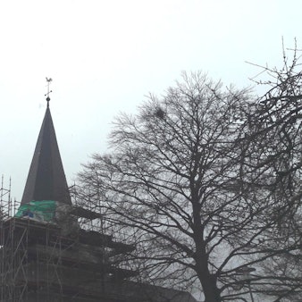 Marienhagen – Drei neue Glocken im eingerüsteten Turm der Bunten Kirche von Wiehl-Marienhagen haben am Morgen des Karfreitags erstmals Gläubige zum Gottesdienst gerufen, nachdem sie noch vor gut einer Woche unten auf dem Kirchplatz gestanden hatten und auf ihren Einbau im Kirchturm warten.