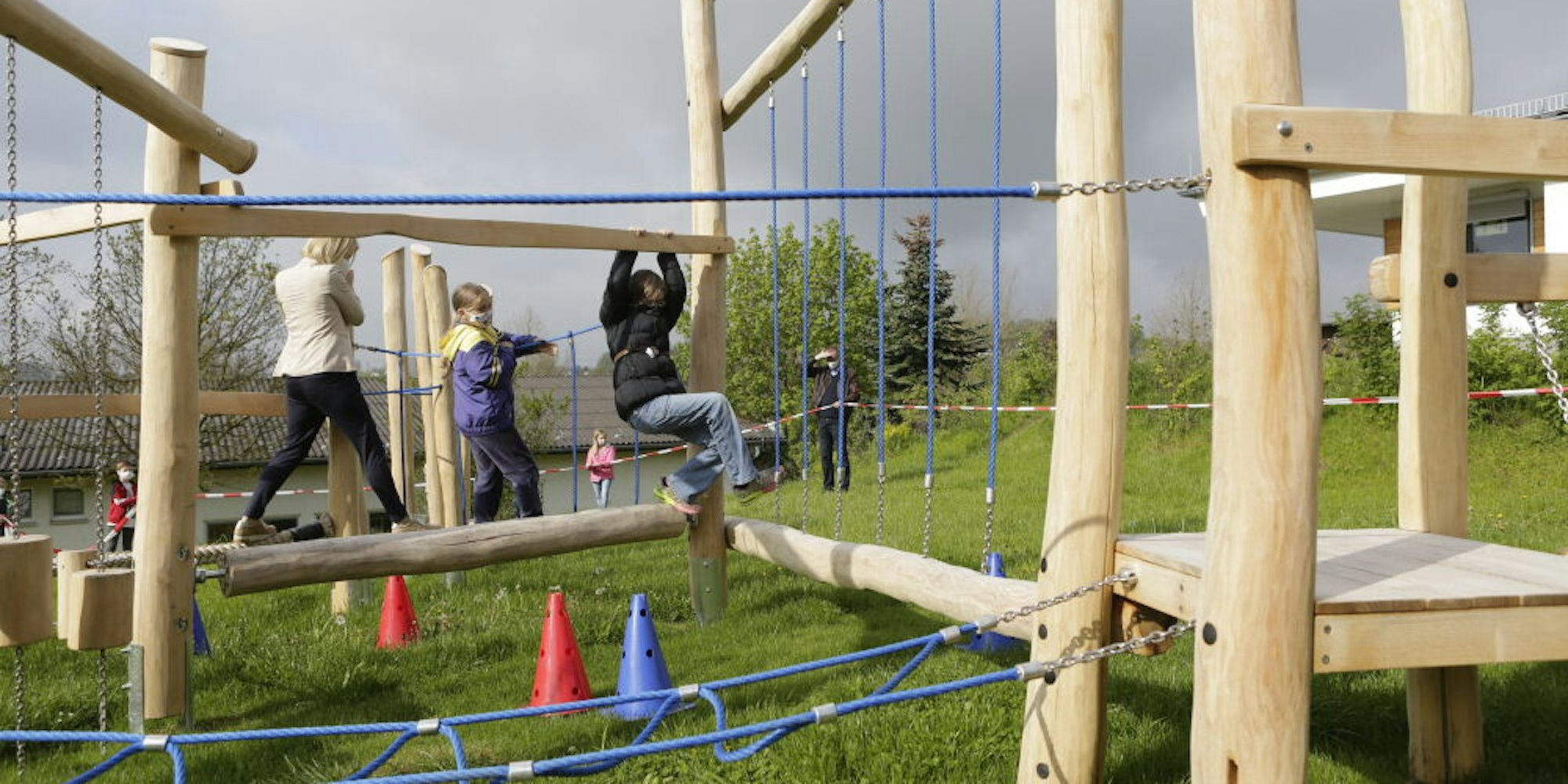 Wackelbrücke, ein rollender Balken, Balancierelemente und Kletterseile vereint die Kletterlandschaft aus Naturholz. Selbst Bürgermeisterin Anne Loth traute sich auf den Parcours. Und war wie die Kinder „einfach begeistert“.