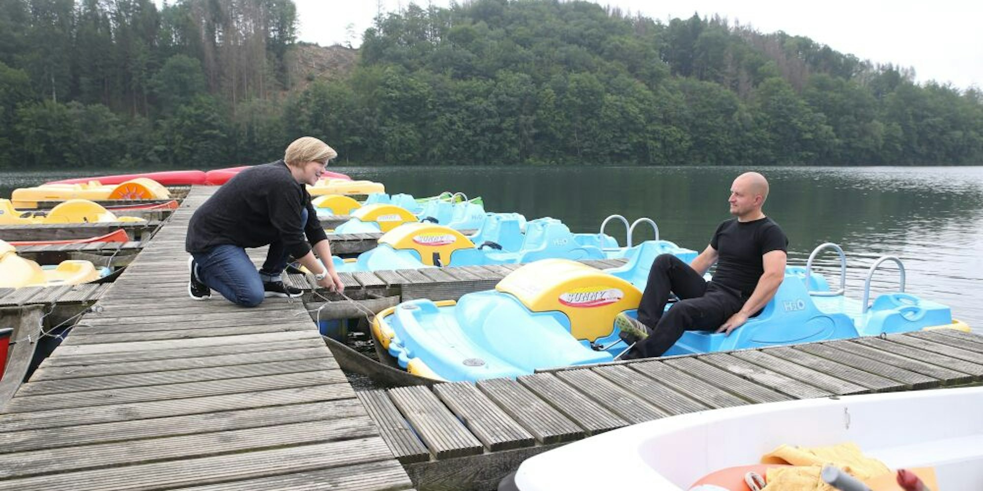 Auch der Tretbootverleih gehört zum Campingplatz, den Björn Rolfs und Miriam Klein nun in der ersten Sommersaison leiten.