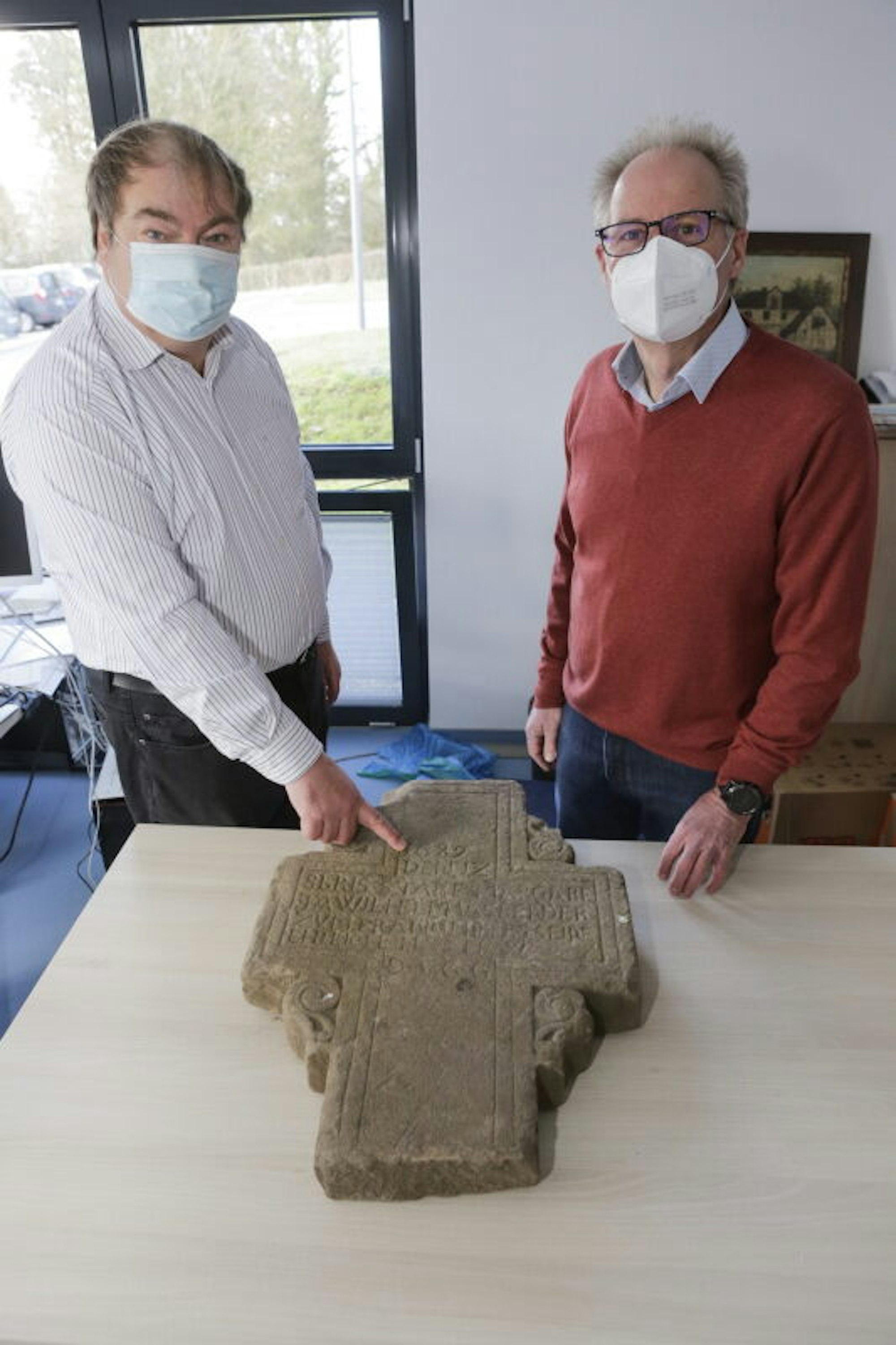 Müller hofft damals, dass die lange vermisste Altenrather Sühnetafel wieder zum Vorschein gekommen ist. Ziemlich genau ein Jahr und unzählige Stunden Forschungsarbeit später steht nun fest: Jörg Müller zog an jenem Märzabend 2020 nicht die abhandengekommene Platte aus dem Dreck (siehe dazu Kasten). Sondern den derzeit ältesten erhaltenen Grabstein in der Gemeinde.