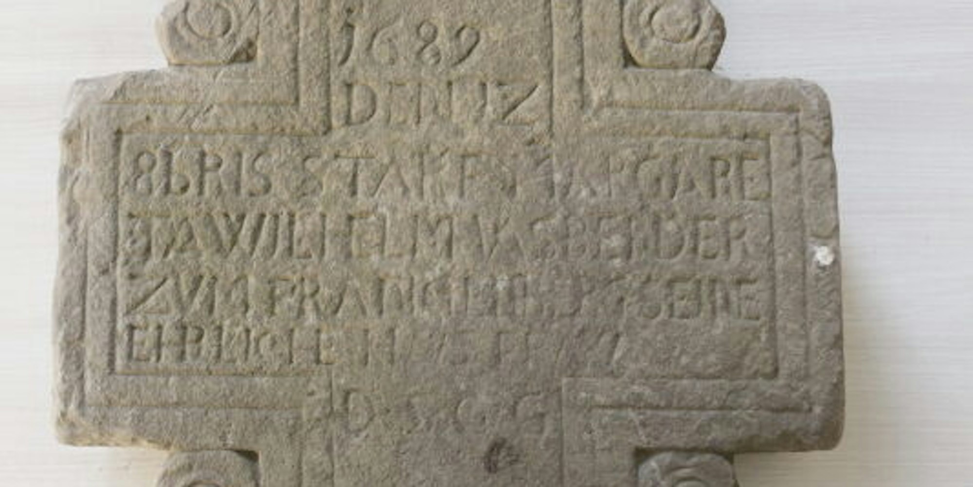 „Als ich die Jahreszahl 1689 gesehen habe, war mir schnell klar, dass dieser Fund etwas Besonderes ist“, blickt Müller zurück. Rund 70 mal 50 Zentimeter misst der Sandstein im Kreuzformat, dessen Inschrift an den Tod einer Margaretha Faßbender am 2. Oktober vor 332 Jahren erinnert. Die in den Stein gehauenen Buchstaben verraten außerdem, dass Margaretha mit einem Wilhelm verheiratet war und in dem kleinen Örtchen Frangenberg nahe Linde lebte. Die Rückseite ist einem Petter Faßbender gewidmet, verstorben an einem 5. April, allerdings ohne Angabe des Jahres, und vermutlich der Sohn der Margaretha.