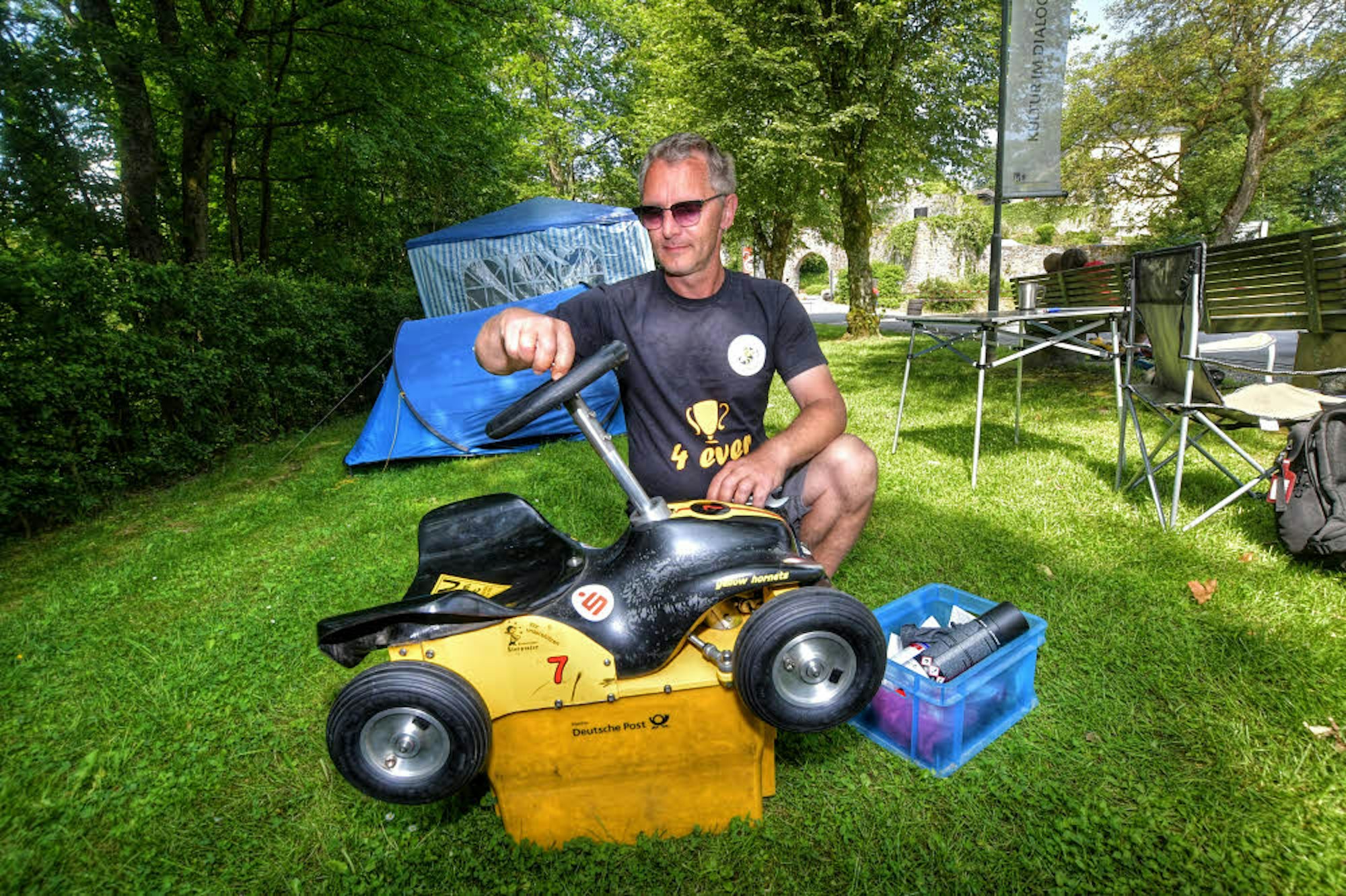 Und so versammelte sich dieser besondere Renn-Zirkus jetzt für ein Wochenende unterhalb des Schlosses. Aus ganz Deutschland kamen die Fahrer, viele aus den südlichen Bundesländern. „Man kennt sich, man trifft sich ja immer wieder“, sagt Gerd Flurschütz, der gerade sein Bobby-Car für den kurzen, kurvigen und von Kopfsteinpflaster geprägten Schlosskurs optimiert.