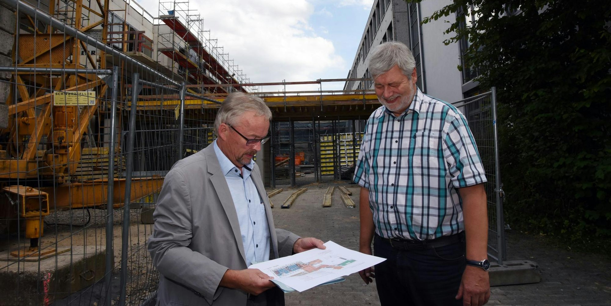 Bürgermeister Hilko Redenius (r.) und Bauamtschef Manfred Schneider stehen vor dem Neubautrakt (links) und der Sekundarschule (rechts).