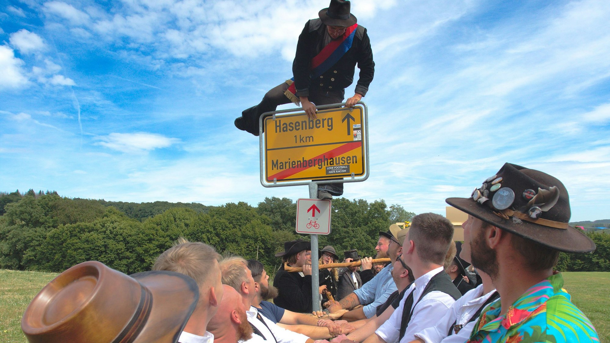 Nach dreieinhalb Jahren, tausenden von Kilometern und ebenso vielen Abenteuern trennt Max Fischer am Samstagnachmittag nur noch das Ortsschild der Nümbrechter Ortschaft Marienberghausen vom Ende seiner Walz. Doch dieses Schild muss im wahrsten Sinne des Wortes überwunden werden: Zuerst fliegen Wanderstock und Habseligkeiten darüber, dann geht es – gestützt auf die Wanderstöcke der mitgereisten Wandergesellen – hinauf.