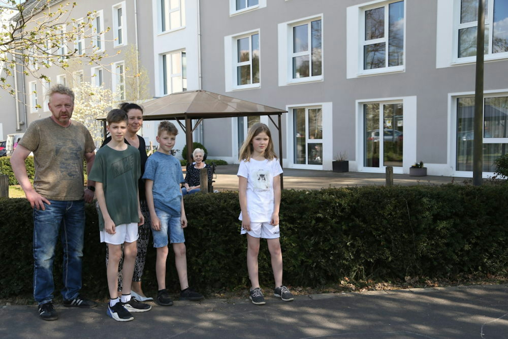Zu Besuch bei Oma Irmela, aber mit viel Abstand: Familie Hermann aus Morsbach-Wendershagen achtet der Großmutter zuliebe auf die Diszanz. Man unterhält sich eben über die Hecke zum Kurpark.
