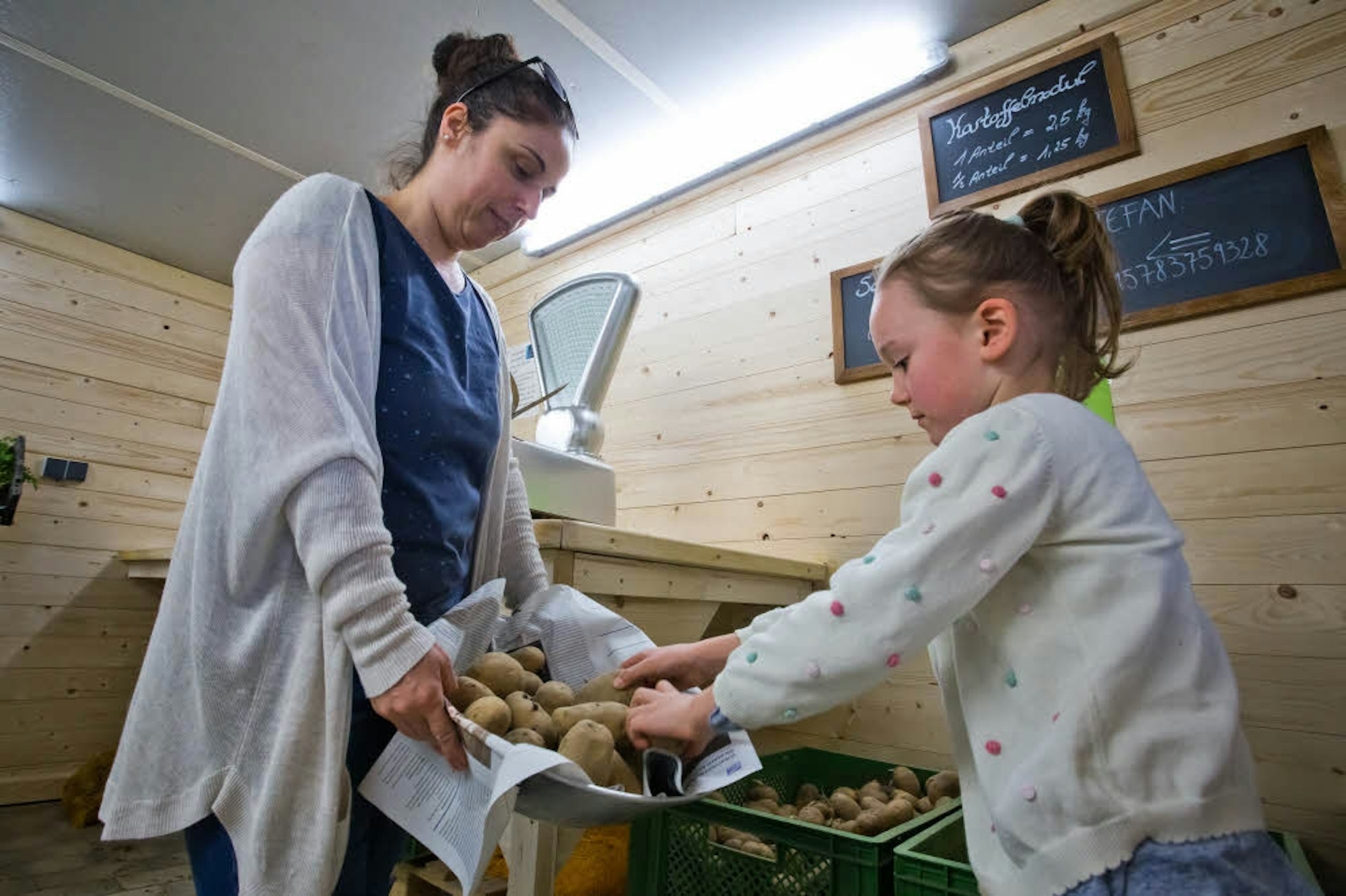 Im Hofdepot werden Kartoffeln und Austernseitlinge abgewogen.
