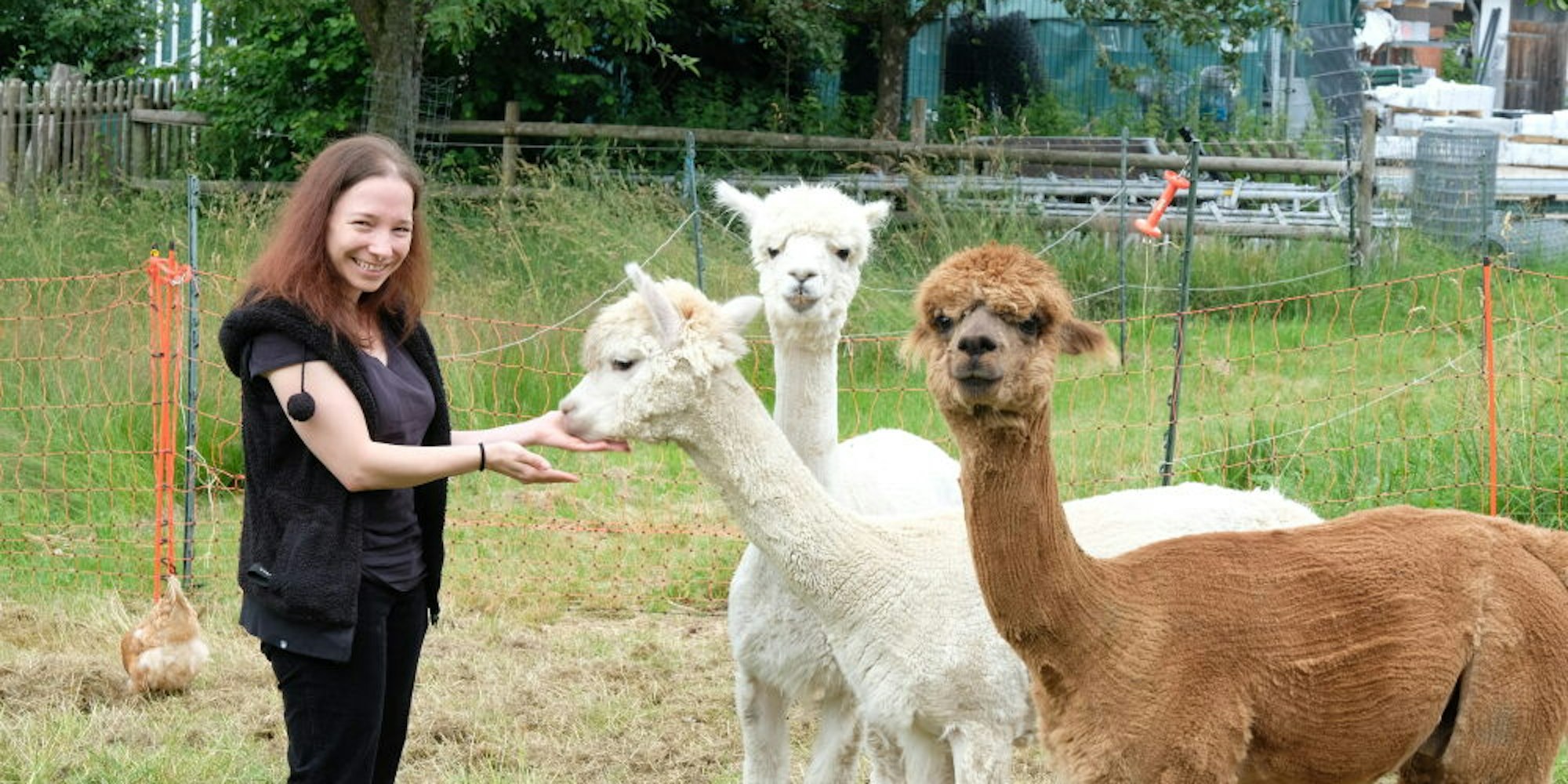 Für diesen Sommer hat sich Bianca Jepp eine Wanderung mit Alpakas vorgenommen – und den letzten Platz in der Gruppe ergattert. Als sie davon berichtet, sieht sie sehr glücklich aus. So glücklich wie in dem Moment ein paar Minuten früher, als die drei Alpakahengste Fridolin, Leo und Goofy an ihren mit Müsli gefüllten Händen schnupperten. „Diese Alpakas sind die hübschesten Tiere überhaupt.“