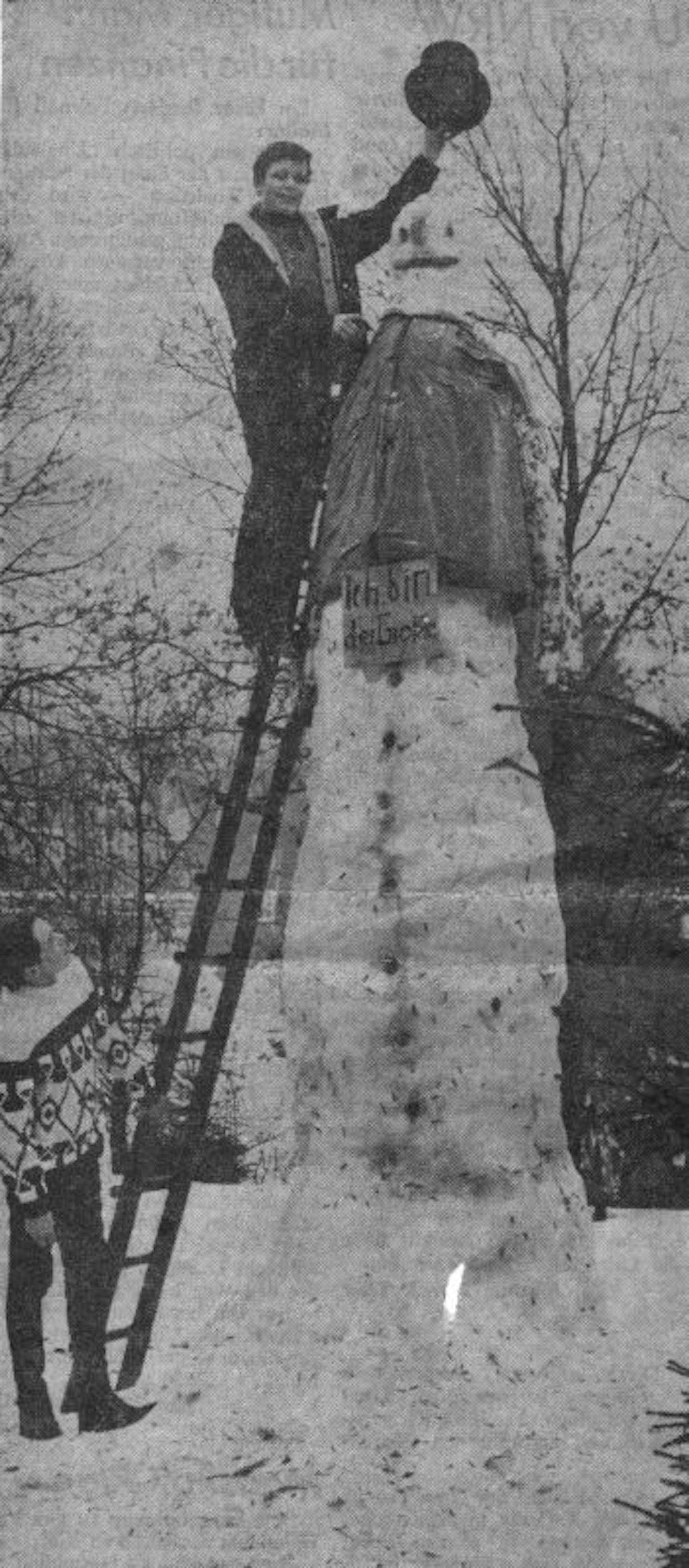 Mittlerweile ist in den sozialen Medien die Verzwergung der Schneemenschen ein viel diskutiertes Thema, denn ob der Seltenheit und Knappheit des weißen Baumaterials seien deutschlandweit viele Schneemännchen nur noch. Vor mehr als 50 Jahren berichtete die Oberbergische Volkszeitung im Januar 1970 von einem über fünf Meter hohen Goliath, den zwei Schüler aus Eckenhagen errichtet hatten. Norbert Flitsch erinnert sich noch gut an den Bau des Riesen, der rund fünf Wochen über dem Dorf thronte.