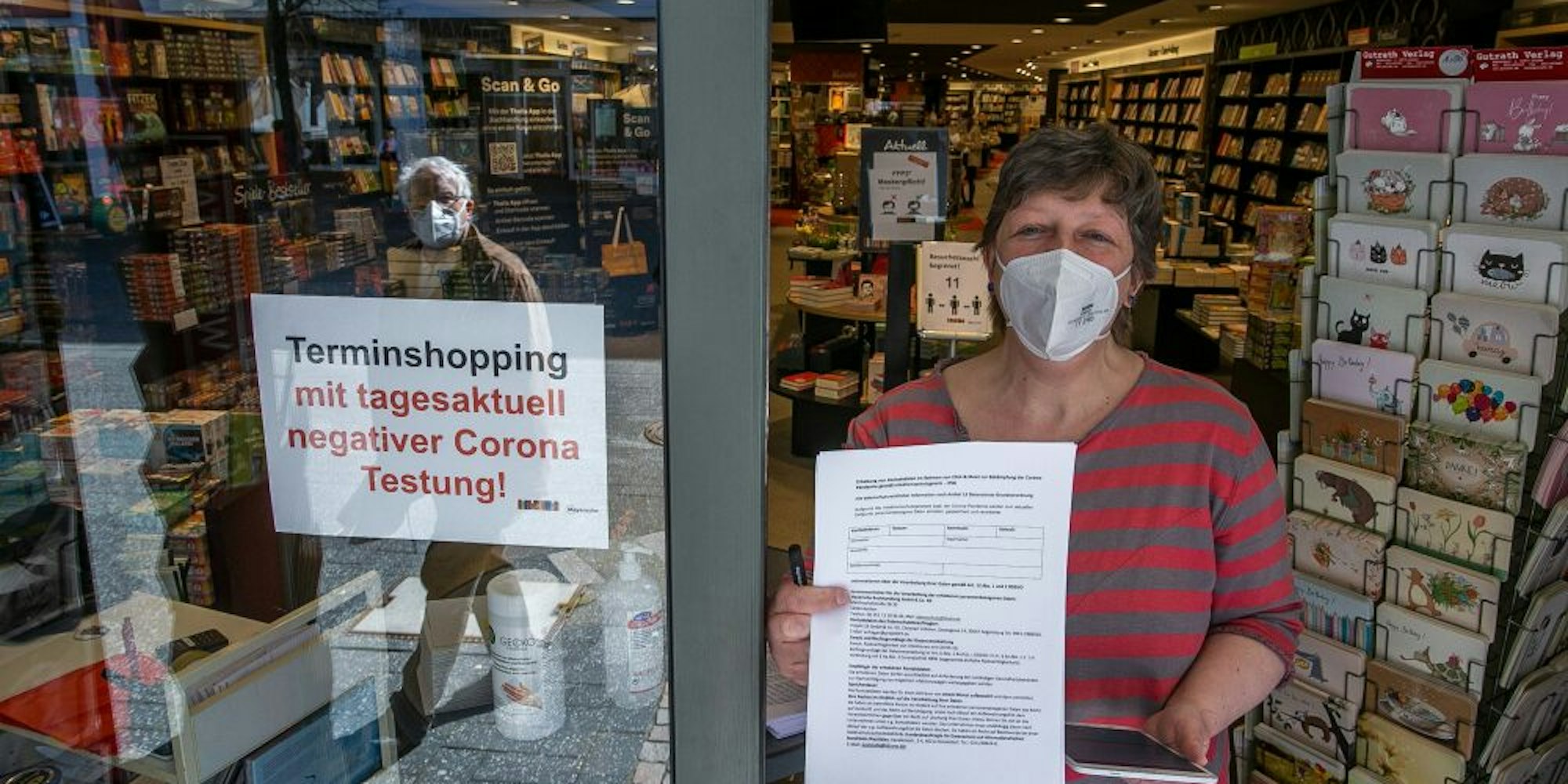 Auch im „Modewerk Andrea Jahn“ wartete Filialleiterin Gunda Herold noch auf die erste Einkäuferin mit Corona-Test. „Wir müssen jetzt schauen, ob die Möglichkeit angenommen wird“, sagte Herold: „Vielleicht wissen viele auch noch nicht, dass für den Einkauf ein Selbsttest nicht ausreicht, sondern es einen Nachweis von einem der offiziellen Testzentren braucht.“ Deren Zahl war bis zum Wochenende auf mehr als 100 angewachsen, wie der Kreis berichtete. Bei der Mayerschen Buchhandlung hatte Filialleiterin Elke Geldmacher schon damit gerechnet, dass die Einkaufswoche unter neuen Bedingungen schleppend anlaufen würde. Auch sie hatte noch keinen Kunden mit Testergebnis.