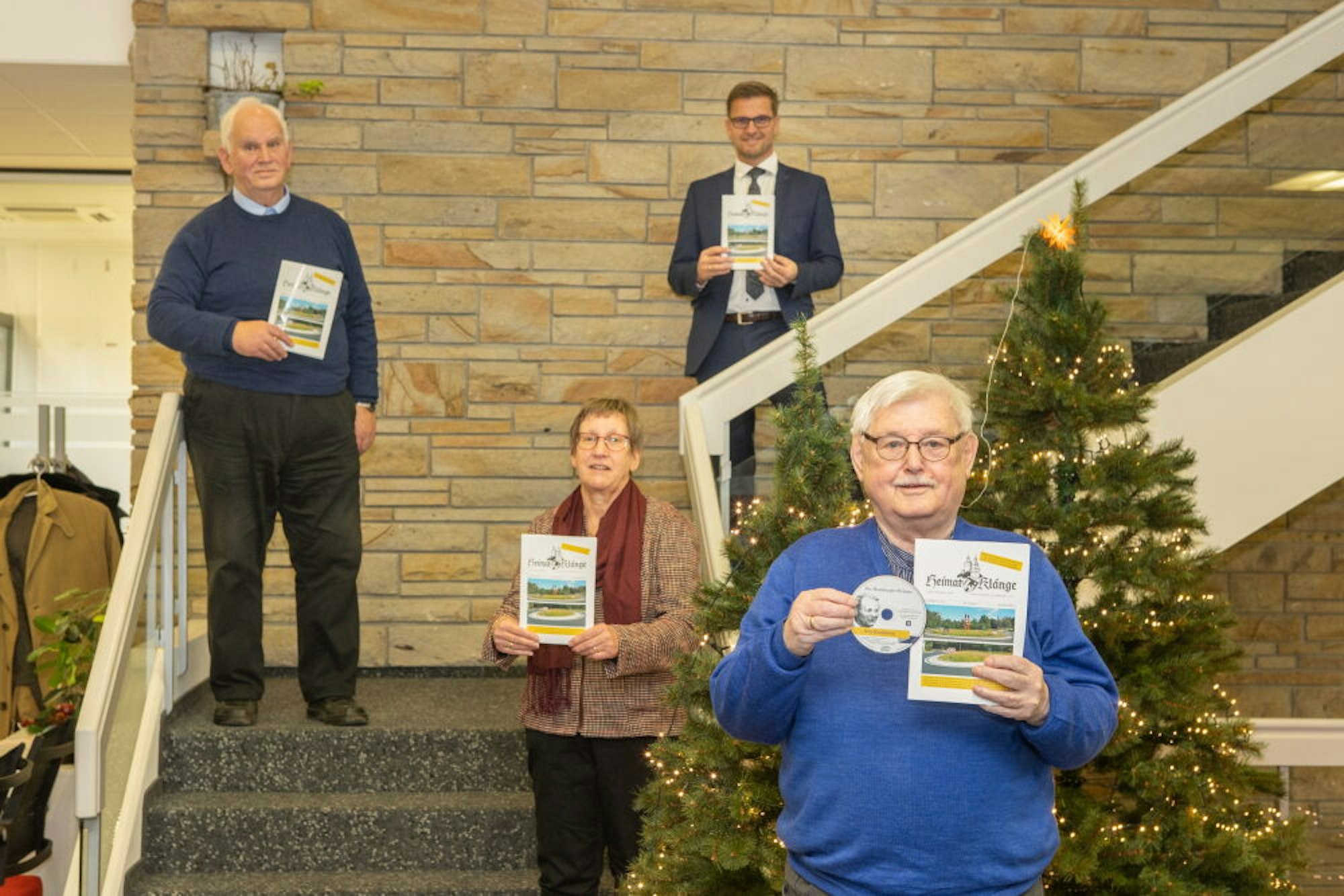Die neuen Heimat-Klänge: Dieter Hüschemenger (v.l.), Elke Holländer-Pracejus, Volksbank-Niederlassungsleiter Henning Jung und Ulrich Runkel bei der Vorstellung im Dezember.