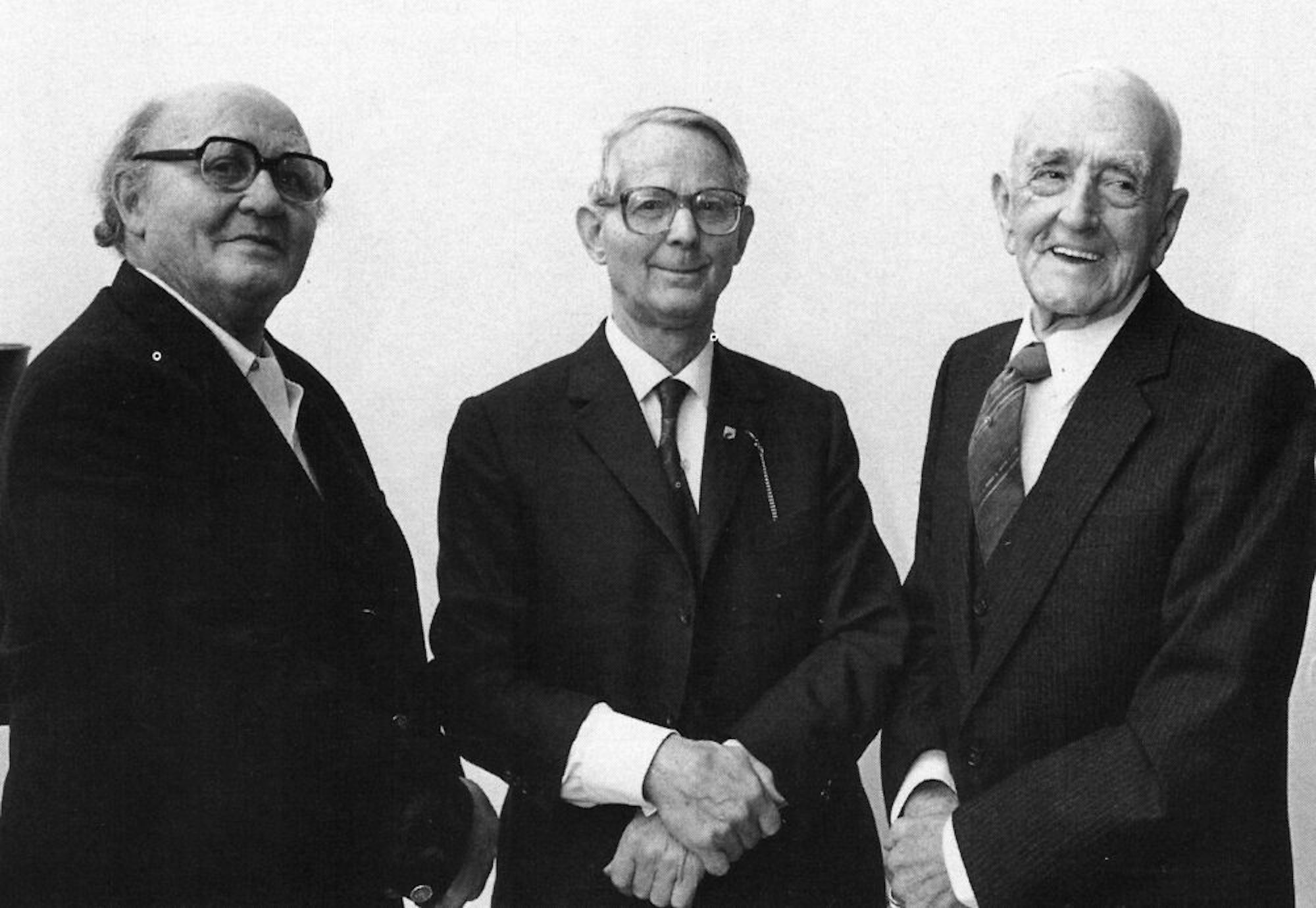 Otto Kaufmann (M.), mit dem Ründerother Künstler Otto Seeligmann (l.) und Ernst Heckmann, Bäcker und im Vorstand der Raiffeisenbank.