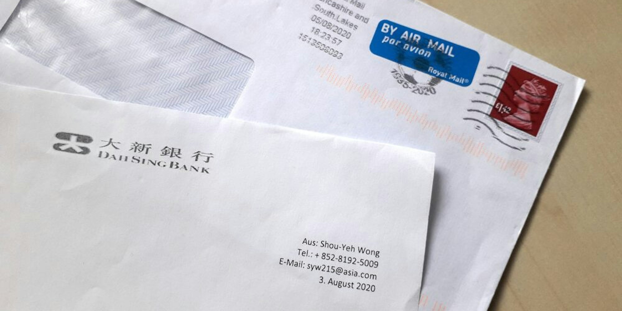 Die im Briefkopf genannte Dah Sing Bank gibt es in Hongkong tatsächlich. Dass der Brief in England frankiert und gestempelt wurde, ist dagegen ein Schönheitsfehler wie auch allerlei sprachliche Unregelmäßigkeiten, wie sie typischerweise Übersetzungsprogramme erzeugen.