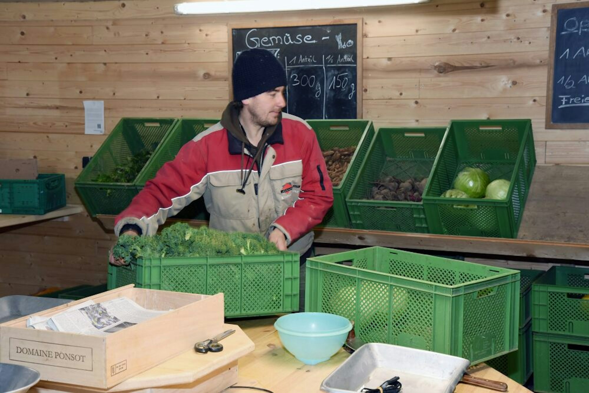 Dort gibt es nicht nur Gemüse, wie die klassischen Kohlarten, sondern beispielsweise auch Zwiebeln, Rote Bete oder Möhren, die von Tim Vehlewald nach der Ernte in einer Sandmiete eingelagert wurden und so den ganzen Winter über frisch bleiben.