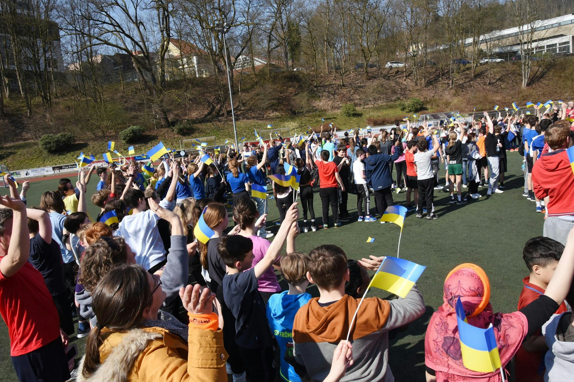 Beim Sponsorenlauf für kriegsvertriebene Menschen aus der Ukraine sind am Dienstag alle Schülerinnen und Schüler und auch Teile des Kollegiums des Aggertalgymnasiums Engelskirchen an den Start gegangen. „Wir haben vor zwei Wochen entschieden, dass wir den Kindern die Möglichkeit geben wollen, sich für die Ukraine zu engagieren“, erklärt ATG-Schulleiter Balthasar Rechner. Zugleich sollte Geld für die lokale Flüchtlingshilfe gesammelt werden. Da lag die Idee zum Sponsorenlauf nahe.