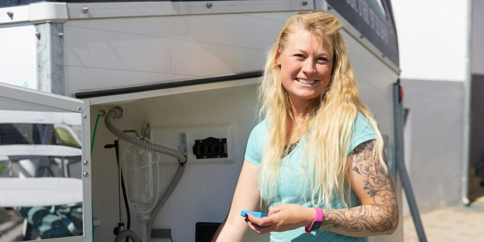 Für ihre Sole-Anwendungen verwendet Hunold eine fünfprozentige Solelösung mit Salz aus dem Toten Meer, die reich an Magnesiumsalzen ist und entspannend und entzündungshemmend wirkt. Die Wärme von zwei Infrarot-Heizplatten im Pferdeanhänger sorgen zudem dafür, dass die Gefäße erweitert und die Durchblutung der Tiere verbessert werden.