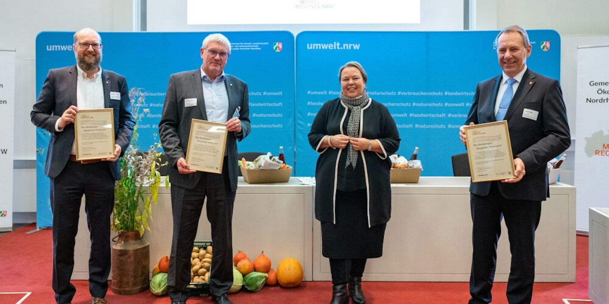 Die Urkunden von Ministerin Heinen-Esser nahmen (v.l.) Bernhard Fleischer (Rhein-Berg), Sebastian Schuster (Rhein-Sieg) und Oberbergs Landrat Jochen Hagt entgegen.