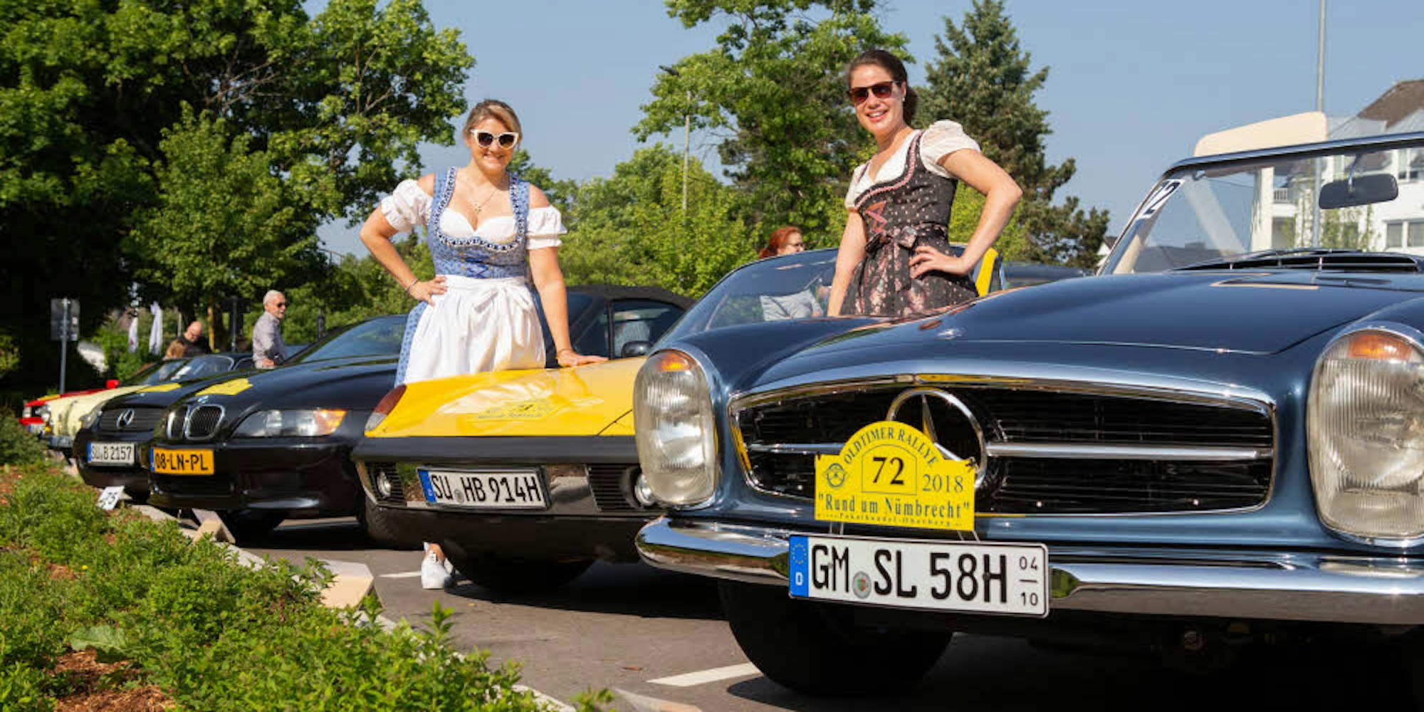 Doch nicht nur die Fahrzeuge zogen die Aufmerksamkeit auf sich. Im Dirndl bekleidet nahm Kathrin Bungenberg, gebürtig aus Much, wohnhaft jedoch im niederländischen Rotterdam, zusammen mit Niki Jegen erstmals an der Fahrt Teil. Mit dem Porsche 914 aus dem Jahr 1972 bildeten die Anfängerinnen einen Teil der drei Fahrzeuge umfassenden Kolonne, aus Holland, zu denen auch die Eltern gehören. Im Falle des „Scheiterns“ hatten die beiden jedoch schon eine Notlösung parat: „Wenn wir eine Abbiegung verpassen setzen wir uns einfach auf die Terrasse.“ Um genau solchen Szenarien vorzubeugen, wurden die Neulinge vor dem Start der Fahrt bereits intensiv eingewiesen. Klärungsbedarf gab es vor allem beim Boardbuch und den sogenannten Chinesenzeichen, nach denen die Teilnehmer der Touristenklasse fahren müssen. Die Brüder Marco und Jens Wirtz nahmen sich für die Fahrer Zeit und stellten sich den Nachfragen. Dabei hoben sie vor allem die Wichtigkeit der Schilderkontrollen hervor, wo die Stempel für den jeweiligen Abschnitt abgeholt werden mussten. „Die Einführung ist wichtig, damit die Neulinge einen Überblick über Hinweisschilder, Kreuzungen und Hindernisse bekommen. Die alten Hasen wissen schon was sie tun“, erklärt Kohlmann.