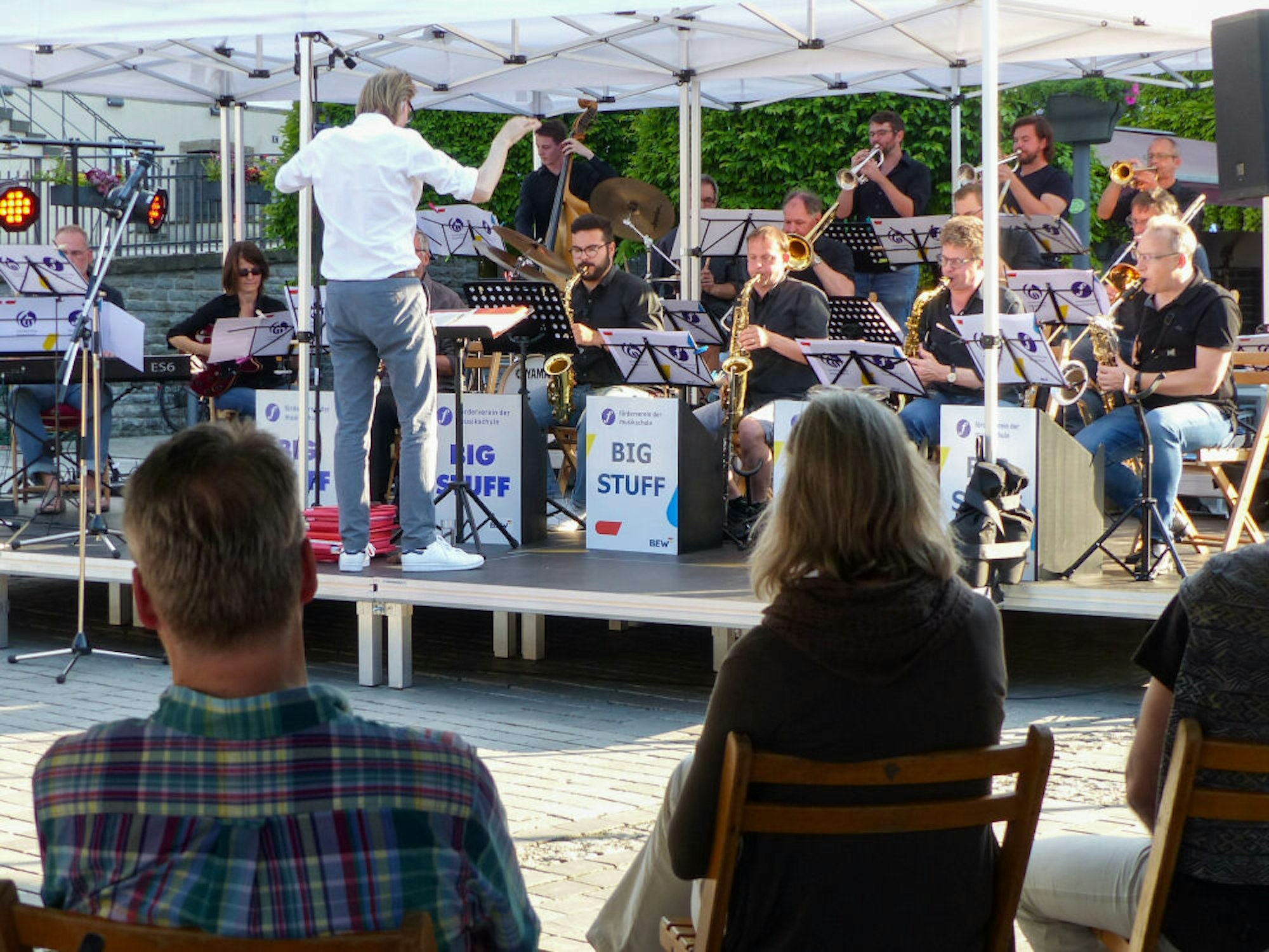 Am Abend geht es mit „Musik am Markt“ und Big Stuff weiter. „In A Mellow Tone“ von Oliver Nelson eröffnet das Konzert. „Wenn man diese Band hört, dass ist für eine Stadt dieser Größe wirklich nicht selbstverständlich. Vor allem so viele gute Solisten sind selten“, lobt Dirigent Marcus Bartelt die Musiker nach dem ersten Stück. „Wäre ich die Wipperfürther Stadtverwaltung, ich wäre mächtig stolz auf diese Band.“