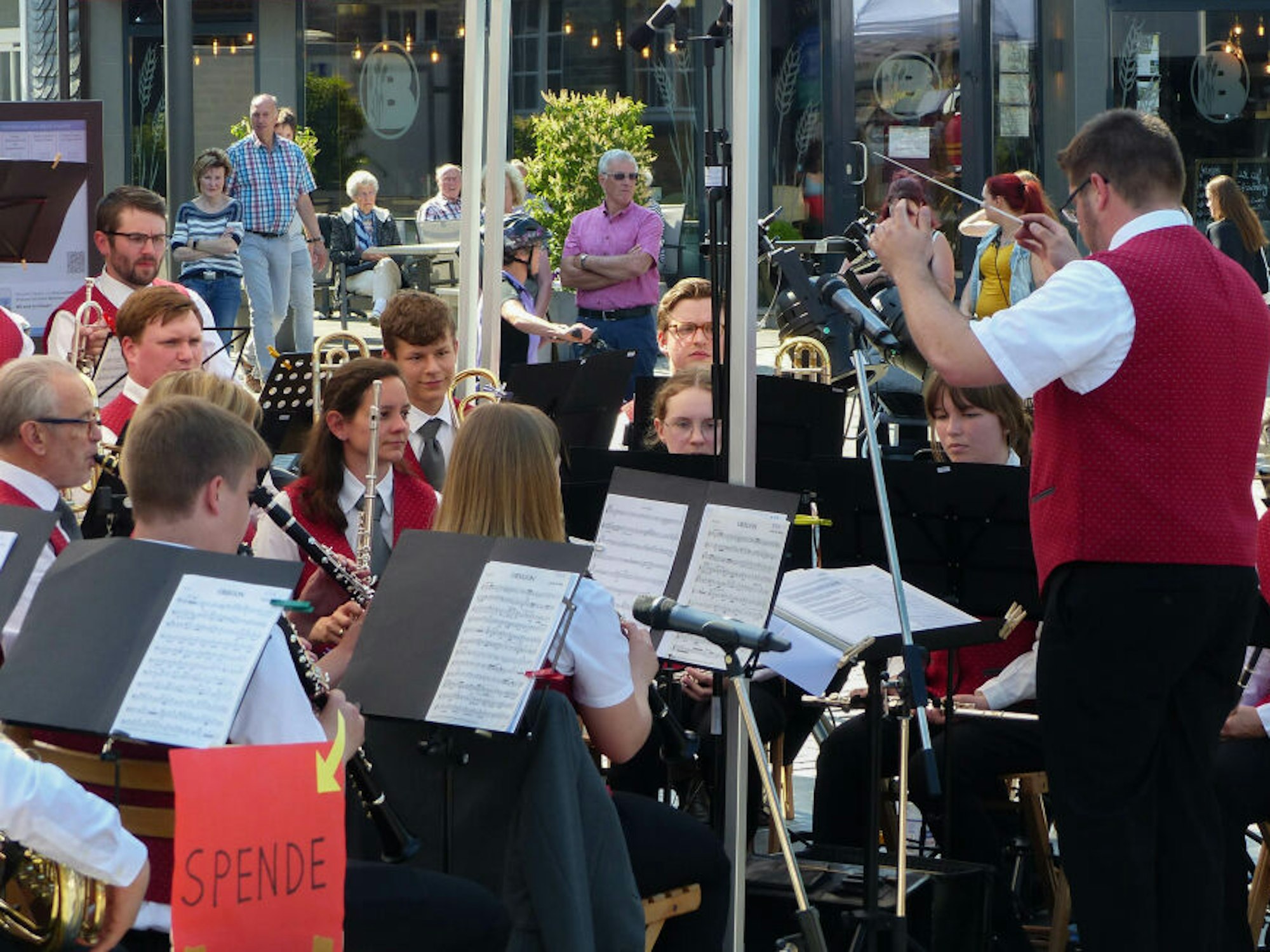 Eröffnet wird das Open-Air-Konzert am Nachmittag vom Jugendblasorchester der Musikschule Wipperfürth unter der Leitung von Detlef Hoffmann. Mit Titeln wie „Havana“, „Happy“ und „The Avengers“ starten sie ins Konzert und erhalten kräftigen Applaus vom Publikum. „Man muss wissen, dass der Musikverein und die Musikschule gerade durch das Jugendblasorchester so stark verbunden sind. Denn hier bilden wir sowohl den Nachwuchs für das Orchester als auf für die Big Band der Musikschule aus“, erzählt Thomas Fahlenbock, Leiter der Musikschule.