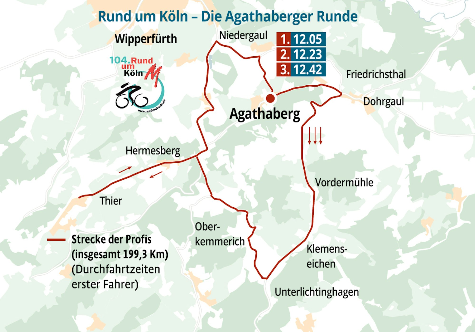 In Wipperfürth. Die Strecke der Profis – das „Eliterennen“ – führt dabei wieder über Wipperfürther Gebiet. Aus Richtung Kürten fahren die Radfahrer auf der L 286 über Jörgensmühle quer durch Thier und von dort über die Höhenstraße weiter bis nach Grünenberg. Von dort, und das ist neu, fahren die Radrennfahrer drei Mal eine Schleife über Niedergaul und Nagelsbüchel hinauf nach Agathaberg, dem höchsten Punkt des Rennens.