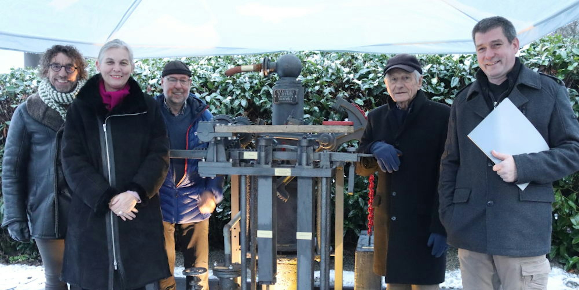 Aufgebaut und eingeweiht worden ist die Lambachpumpe, und zwar von (v.l.) Andreas Berg, Mercedes Slex (Kulturstiftung), Jochen Safarik, Karl-Heinz Warzok und Rüdiger Schmallenbach.