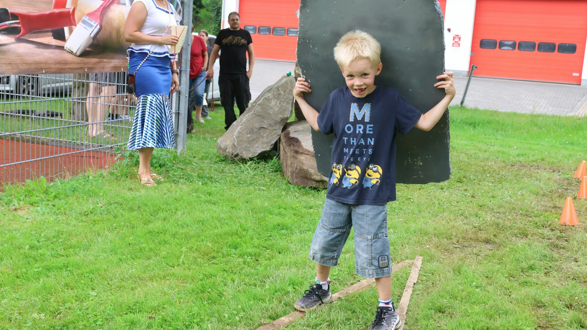 Der Reichshofer Feivel Schorre (sechs Jahre) schnappte sich begeistert gleich den größten Hinkelstein und balancierte ihn mühelos über einen Slalomparcours. Mehr um Geschicklichkeit ging es bei Ommers Mann Christian an der Station „Trefffix“ beim Zielwurf mit Sandsäckchen. Vater Tobias fand das Programm klasse: „In Mittelagger sind wir immer gerne dabei – das ist eine schöne Abwechslung für die Kinder.“ Bei „Berührnix“ erlebten sie ein Riesenmikado, bei „Suchfix“ ging es darum, Fehler zwischen einer Fotografie und dem aus Playmobil aufgebauten gallischen Dorf zu finden, und schließlich mussten die Kinder bei Lina Hansen am Punkt „Felllfix“ aus drei Boxen die richtige mit dem Wildschweinfell erfühlen.