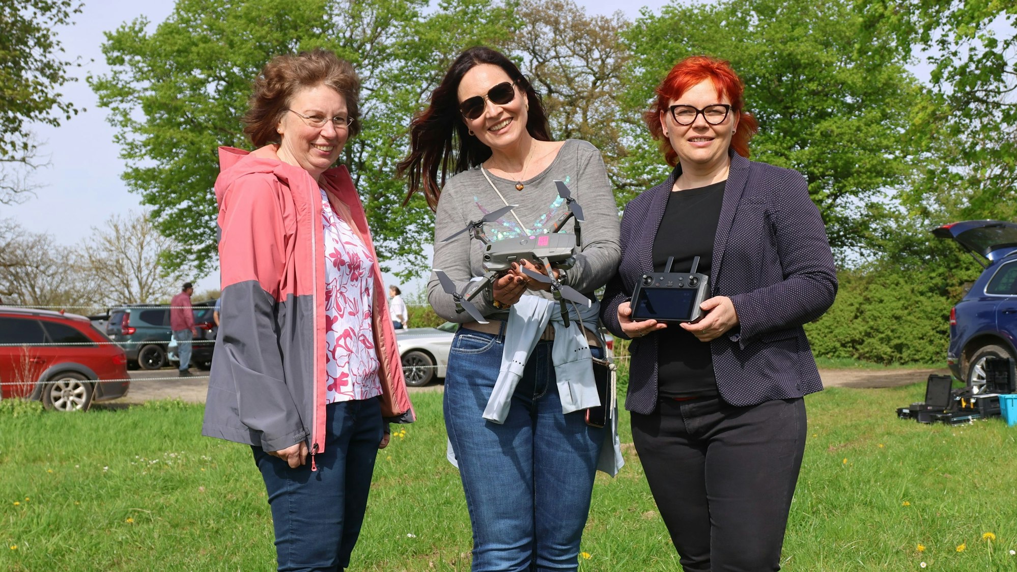 Angelika Bonsch erläutert Katja Pietrzyck (r.) und Petra Trapp (l.) die Drohnensuche.