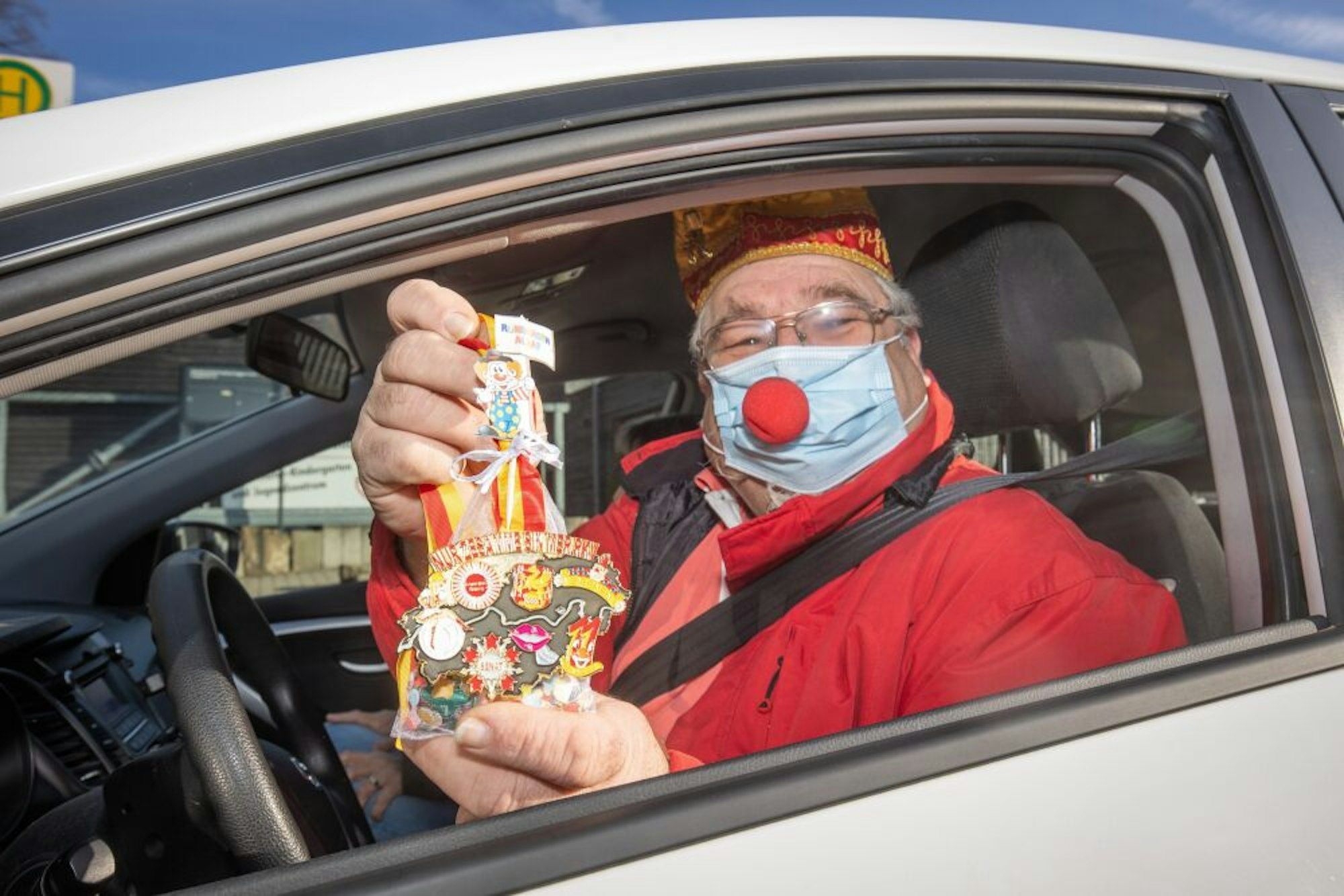 Derweil kommen stetig neue Mitglieder vorgefahren, viele spielen im Autoradio Karnevalsmusik, einige sind kostümiert, wenn auch meist nicht so wild wie das Krümelmonster Oliver Ley. Zwei- und dreimal hingucken müssen die Ordensverleiher ohnehin, hinter der Coronamaske sind die Neuankömmlinge auch unverkleidet schlecht zu erkennen.