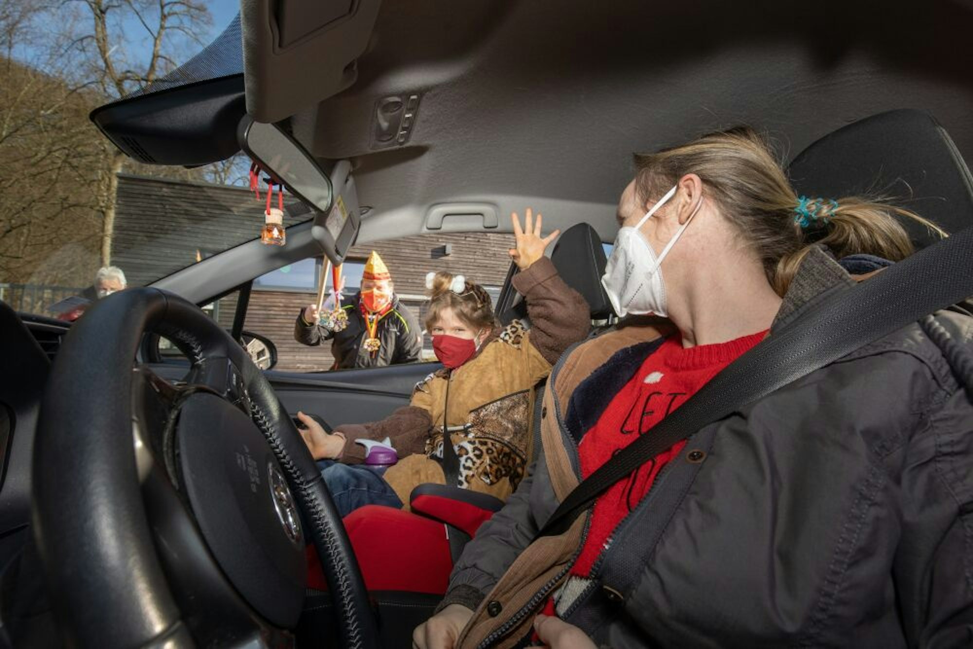 Für die Kinder gab’s Kamelle dazu, für die großen Vereinsmitglieder einen Likör. Franka (8) (im Steinzeitkostüm) freute sich ebenso so jeck wie Egon Baumgart (mit roter Nase vor der Maske) über den Orden, der ihnen durchs Fenster gereicht wurde.