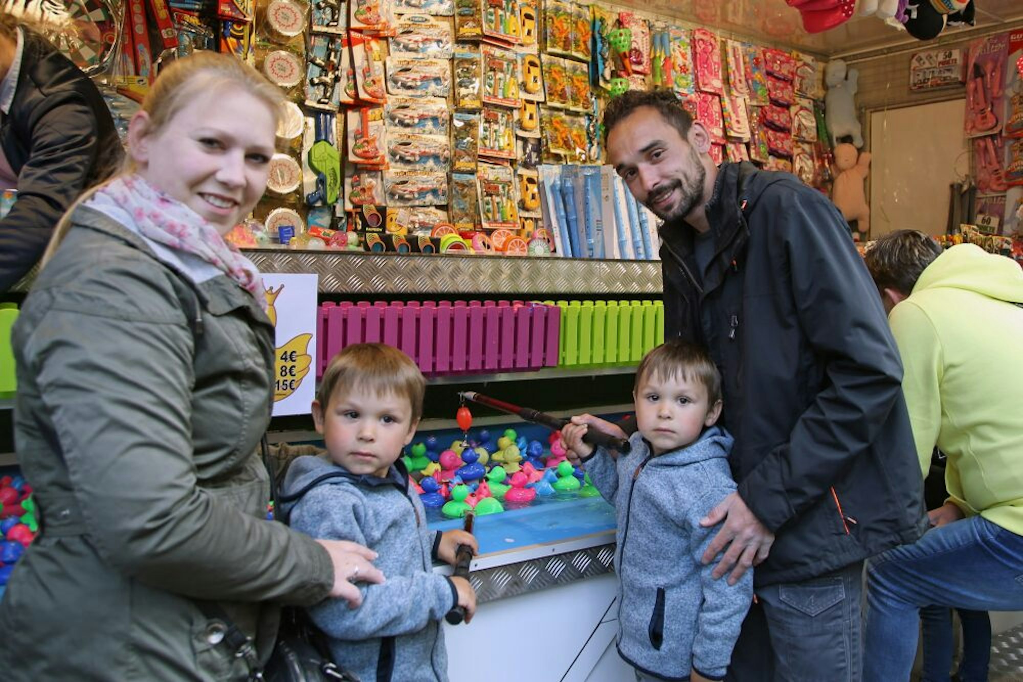 Für die Zwillinge Leon und Robin (3), die kaum genug schwimmende Entchen angeln können, ist es die erste Kirmes in ihrem Leben. Ihre Eltern Markus und Franziska Dressnardt aus Overath kamen vor Corona eigentlich jedes Jahr zur Kirmes nach Ründeroth.