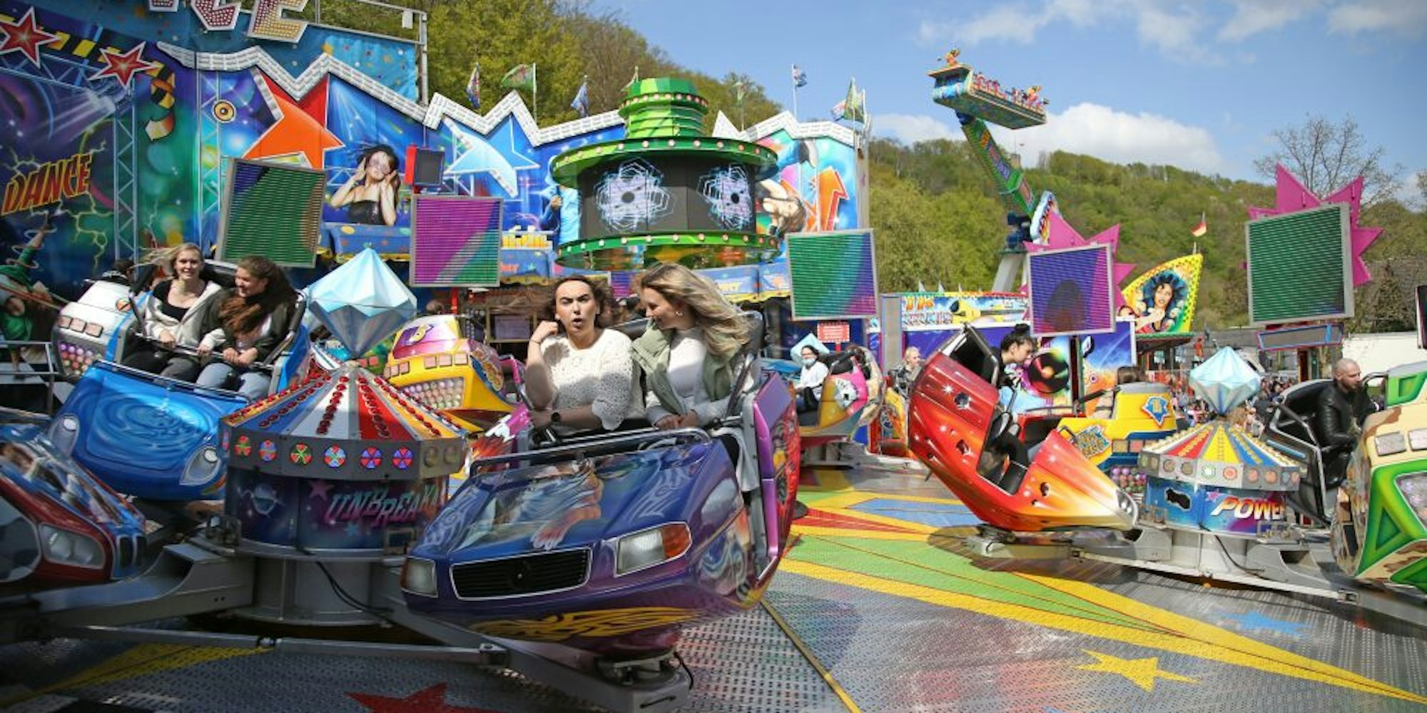 In der Nähe des „Fliegenden Teppichs 1001 Nacht“ – einer Fahrgastgondel, die an einem langen Arm um eine Achse in einer Höhe bis zu 25 Metern schwingt – steht der „Breakdancer“ des Schaustellerbetriebs Bonners. Toni Bonner ist in das Schaustellergeschäft hineingeboren, er vertritt schon die fünfte Generation. Im vergangenen Jahr sei eine halbe Saison genutzt worden, in diesem Jahr ist der Terminkalender voll mit anstehenden Volksfesten. „Den Aufbau des Fahrgeschäfts habe ich über die Pause nicht verlernt, auch wenn es kurz etwas anstrengender ist“, sagt Bonner. Das Maifest sei schon die vierte Veranstaltung in diesem Jahr.
