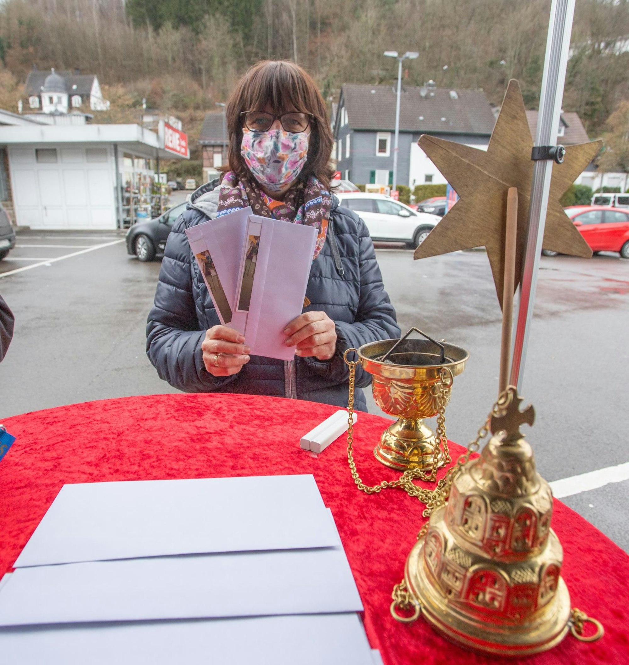 Über den Segen der Sternsinger freut sich unter anderem Carmen Stommel, die sich gegen eine Spende gleich drei Pakete für sich und ihre Kinder abholt.