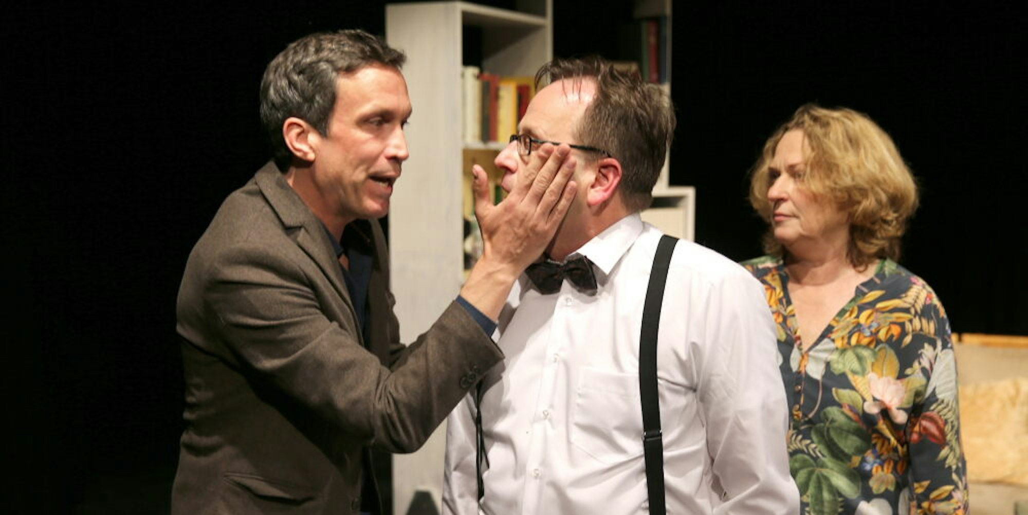 2018 wurde das Stück erfolgreich von Sönke Wortmann fürs Kino adaptiert. Die Inszenierung von Raimund Binder für das Schauspielstudio Oberberg bedient sich der französischen Originalfassung und fährt gut damit. Man darf verraten: „Adolphe“ ist der Vorname, den Vincent (Jörn Wollenweber) für sein Kind ausgesucht hat und über den Pierre (Michael Albrecht) sich echauffiert. Der deutsche „Adolf“ hat hierzulande dann doch eine andere Sprengkraft.