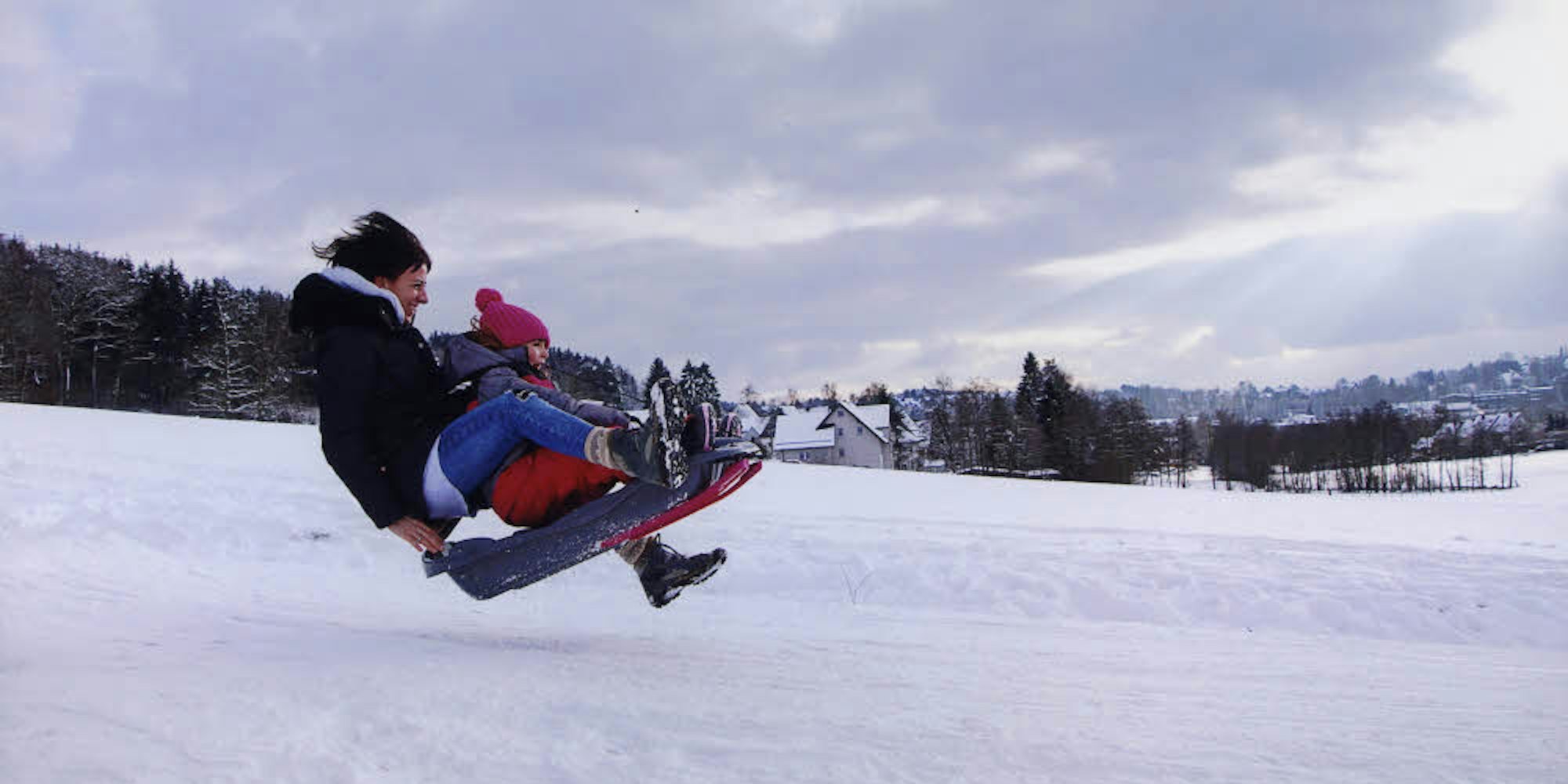 Abheben kann man derzeit im Oberbergischen Land. Schöne Rodelhänge gibt es auch abseits des Reichshofer Skigebiets, etwa am Linger Berg in Marienheide.