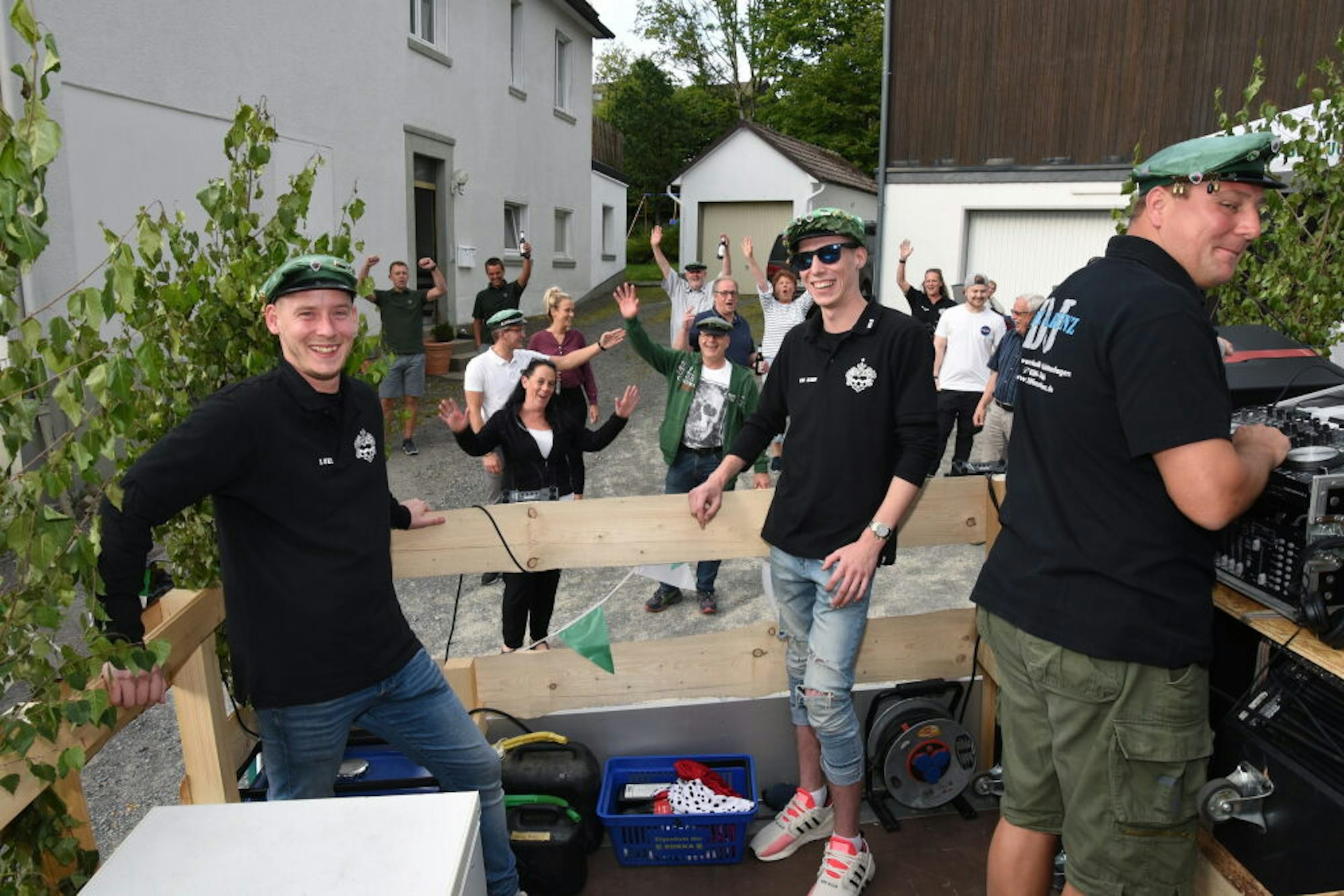 Traditionell fährt in Müllenbach der Schützenkönig am Freitagabend durch den Ort, um alle einzuladen, zum Fest zu kommen. Pausen legt er an den Schmückstationen ein, wo die grün-weißen Fahnen gehisst werden. Die Ankunft des amtierenden Schützenkönigs Robin Schenk kündigte am Freitag laute Marschmusik an. Alles war ein bisschen weniger als sonst, als er bei Thorsten Kehlbreier, Leiter der Hallenkommission, eintraf, wo sich normalerweise gut 70 Müllenbacher treffen. Dieses Mal waren es nur einige Schützenbrüder und ihre Frauen. Nach kurzem Plausch machte sich Schenk weiter auf den Weg. Überall hingen an den Häusern die grün-weißen Fahnen und wer durch Müllenbach spazierte, tat dies mit grüner Mütze.