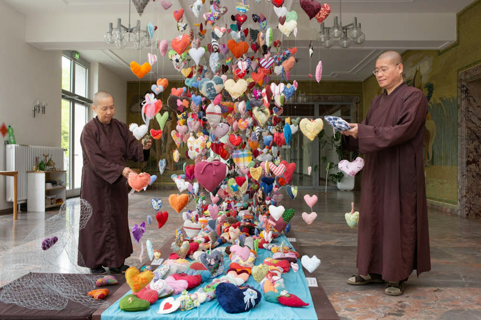 Schwester Song Nghiem und Thay Phap An mit den Heilenden Herzen, einer Aktion, die an das Leid im Nationalsozialismus erinnert.