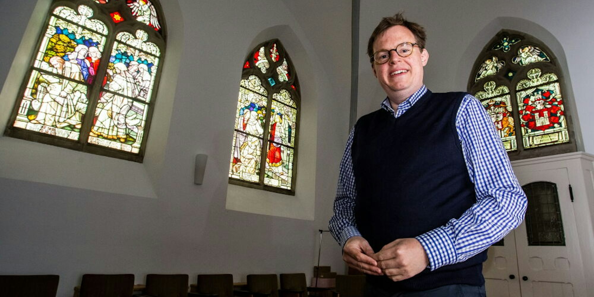 Nümbrecht – Die Verbundenheit zur evangelischen Kirche in Nümbrecht durchzieht das ganze Leben von Buchhändler Mike Altwicker. Der 47-Jährige wurde dort getauft und konfirmiert, erlebte als Schüler eine kunsthistorische Führung durch das Gotteshaus. Vor allem den sogenannten Herrenkeller mit seinen bunten Fenstern empfindet der Nümbrechter als perfekten Rückzugsraum aus dem manchmal hektischen Alltag.