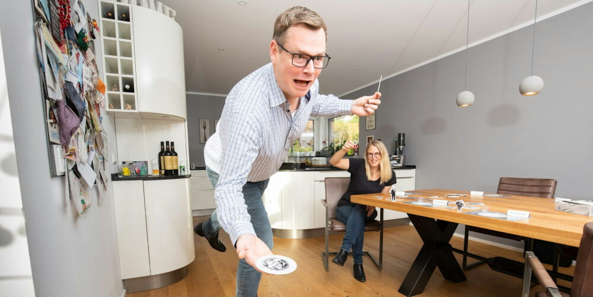 Und ebenso klar war es auch für Inka und Markus Brand aus Gummersbach, sich nach dem Briefing des Ravensburger Verlages hinzusetzen, um ein Partyspiel zum Fernsehkult zu erarbeiten. „Natürlich kennen wir den Sketch seit unserer Kindheit, und auch unsere Kinder sind damit aufgewachsen“, sagt Spiele-Erfinder Markus Brand. Darum gab es kein Zögern, als der Verlag das Paar im Januar 2019 anfragte, sondern den spontanen Gedanken: „Was für eine coole Idee!“. Wenige Monate später war der Prototyp ausgearbeitet, eingereicht, und die Brands hatten sich mit ihren Ideen gegen mehrere Konkurrenten durchgesetzt.