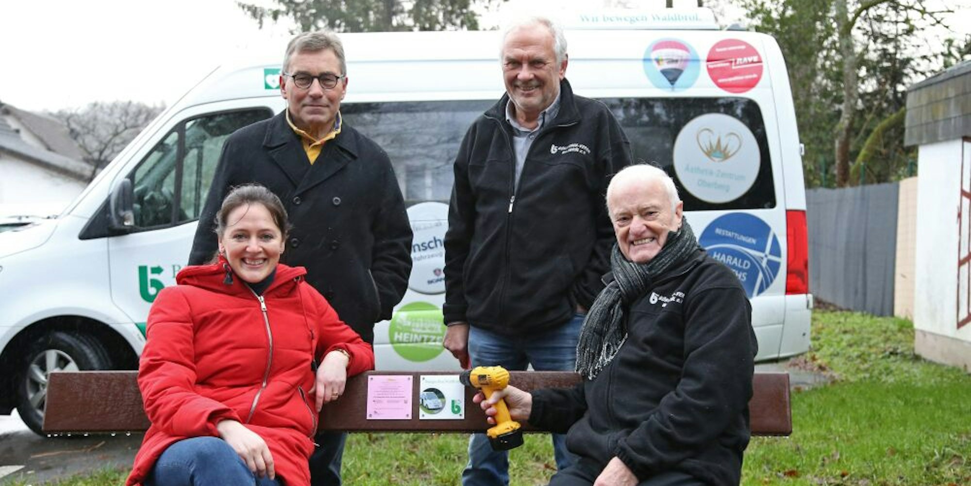 Probesitzen im Regen: Bürgermeisterin Larissa Weber (v.l.), Heribert Lennarz, Michael Jaeger und Reinhard Grüber (alle Bürgerbusverein) weihen die neue Wartebank an der Nümbrechter Straße ein.