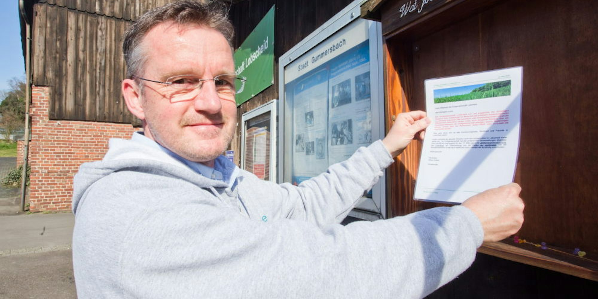 Hilfsangebot: Oliver Kolken vom Vorstand der Dorfgemeinschaft Lobscheid hängt ein Flugblatt aus.