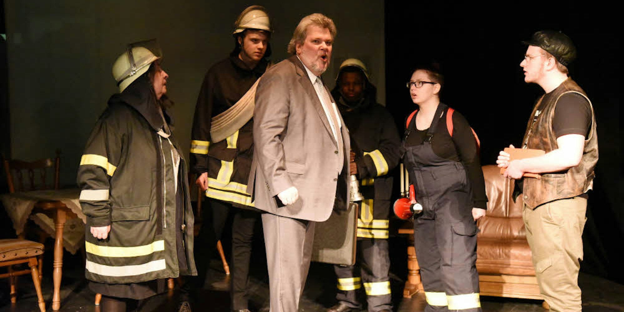 Thomas Knura (M.) in der Rolle des Herrn Biedermann, im Stück von Max Frisch, das vor der Sommerpause in Wiehl gezeigt wurde. „Vom Kostüm her ähnlich wie im Job“, sagt der Schauspieler zu seinem Aufzug lachend.