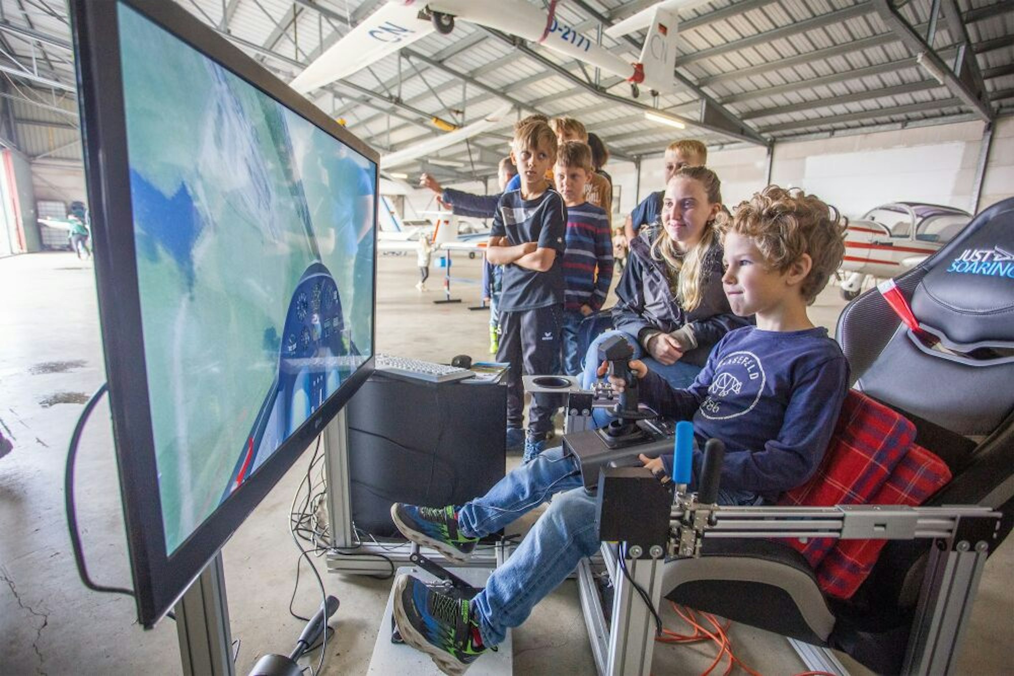 In einer der Hallen stand auch ein Segelflugsimulator, in dem die Besucherinnen und Besucher das Gefühl im Cockpit realitätsnah auskosten konnten. Die achtjährige Bergneustädterin Rugile Ivanauskaite hielt begeistert den Steuerknüppel in der Hand und lenkte den Flieger über die Hänge am Dümpel. Zuletzt gab es aber doch eine Bruchlandung. Kein Problem für die junge Dame: „Das versuche ich gleich noch mal.“ Ihr drei Jahre älterer Bruder Domynikas schaffte dagegen die perfekte Landung: „Ich habe schon einmal im Simulator gesessen.“