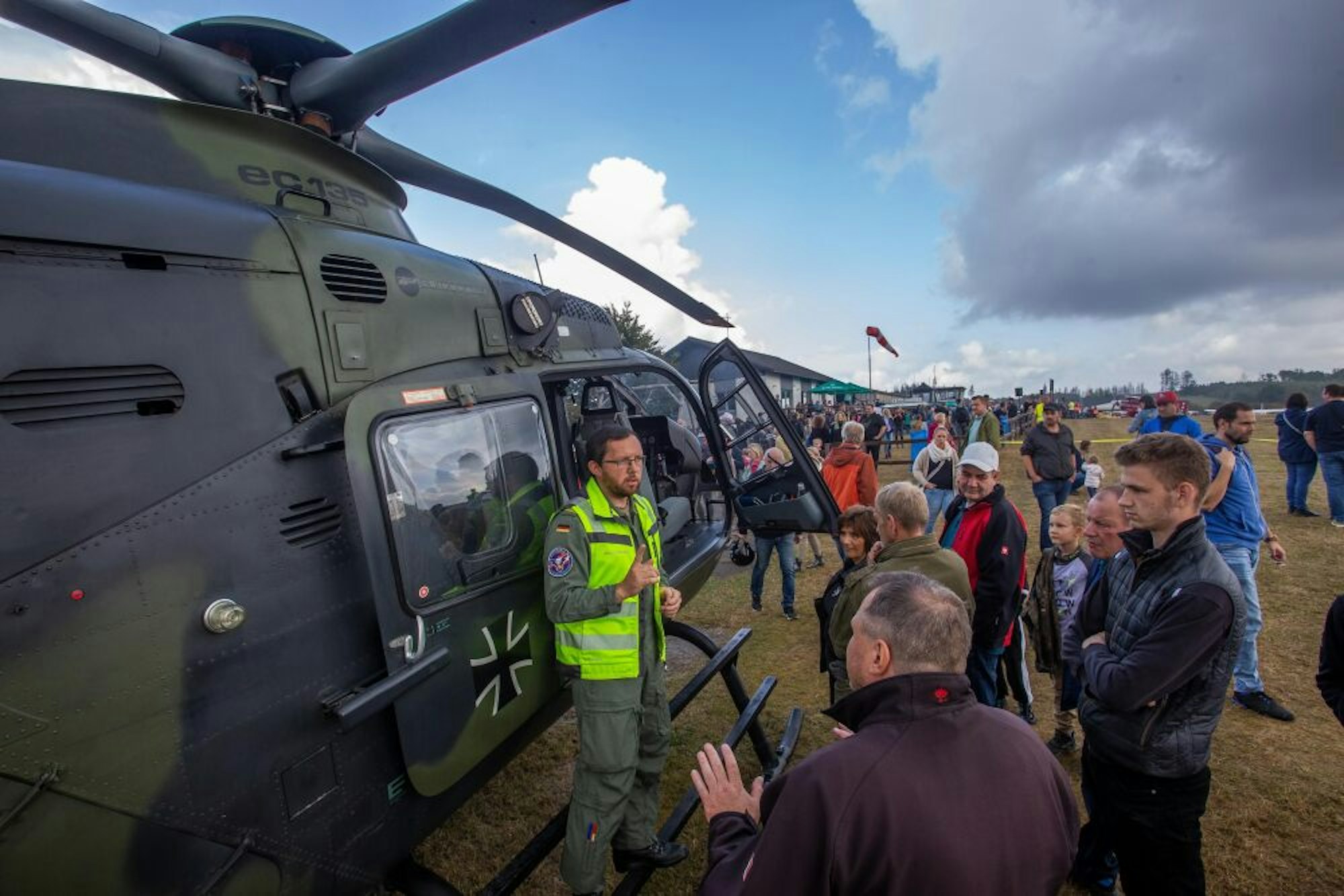 Ein Highlight war auch der Schauflug der Bundeswehr, die mit zwei in Bückeburg stationierte Hubschraubern vom Typ EC 135 gekommen war. Während der eine das ganze Leistungsspektrum der Maschine mit zwei Triebwerken und jeweils 600 PS über dem angrenzenden Maisfeld demonstrierte, stand der andere zu Anschauungszwecken auf dem Boden. Viele der Schaulustigen nutzten die Möglichkeit für ein Selfie vor dem geöffneten Cockpit.