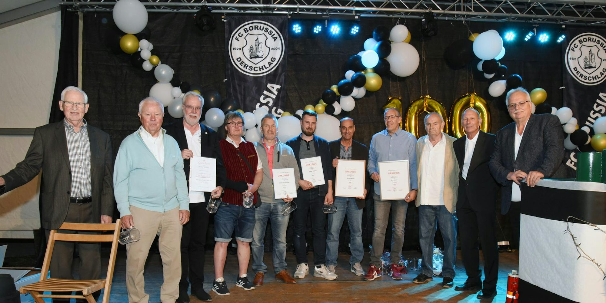 Abschließend bat Peter Wagner die ältesten Verbündeten auf die Bühne. Kurt Kriegeskotte und Hans Kreidewolf sind seit 70 Jahren für die Derschlager als Mitglieder aktiv und feierten bereits in den 1950er Jahren erste sportliche Erfolge. Peter Wagner selbst sowie der langjährige Vorsitzende Manfred Koch und Günter Schneider wurden darüber hinaus mit der Ehrenmitgliedschaft bedacht. Und der beliebte Horst Meister wurde als erste Person überhaupt zum Ehrenbetreuer der Borussen ernannt. „Wenn mal jemand Deine Nachfolge antreten möchte, dann muss er sich schon mächtig ins Zeug legen“, fügte Wagner in seiner Laudatio hinzu.