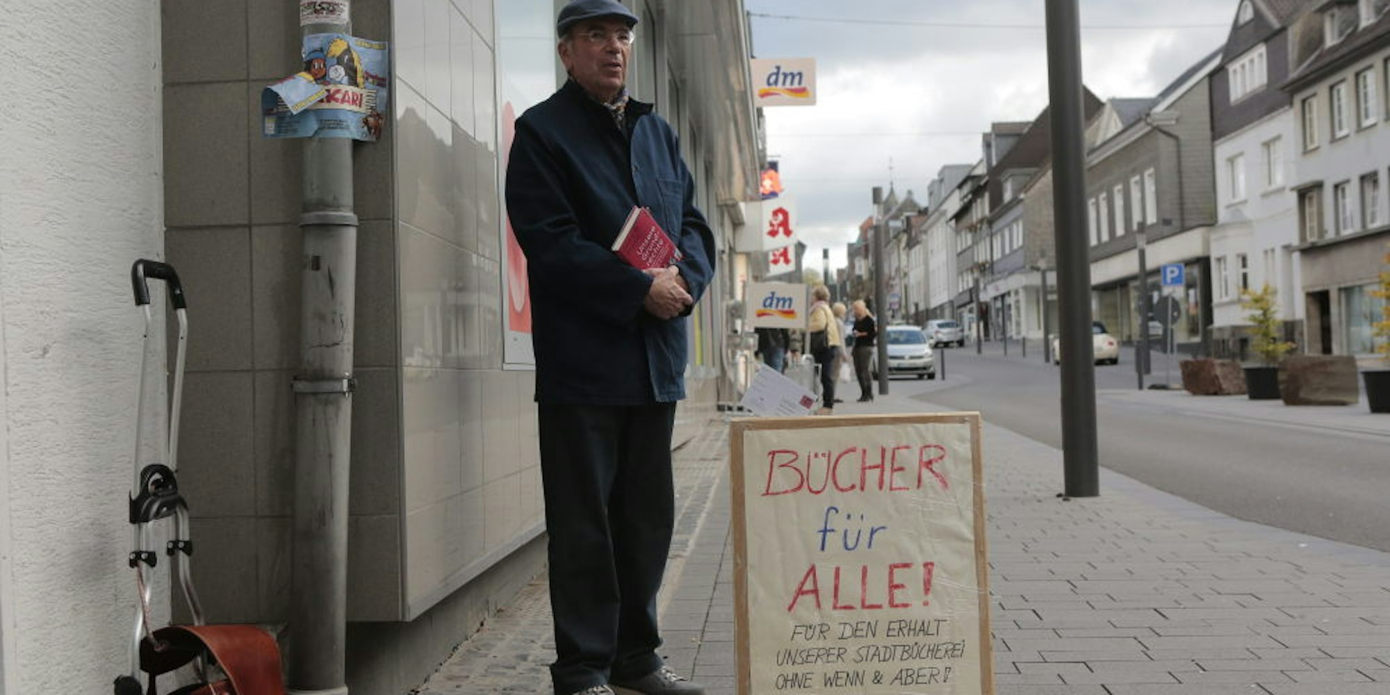 Wipperfürth – Eine Stärkung der Stadtbücherei hat Michael Wittschier am Samstagmittag auf der Hochstraße gefordert. „Bücher sind Lebensmittel – sie werden täglich gebraucht“ steht auf dem Schild, das die Blicke der Passanten anzog. Der Künstler und ehemalige Lehrer protestierte mit der Aktion gegen die Bibliotheksschließung an Dienstagen, die Verzögerung bei der Neubesetzung einer zweiten Stelle und für den Umzug der Bücherei ins Stadtzentrum. „Dieser ist längst überfällig, ihr Zugang müsste barrierefrei gestaltet werden“, so Wittschier.